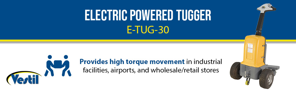 The Electric Powered Tuggers are suitable to use in airports, hospitals, and wholesale and retail stores. They can be used in a variety of applications like pulling industrial carts, hoppers, trash cans, trailers, and tow bars. E-TUG-10/20/30: Ideal to PULL loads without extreme stress or strain on the user's body. E-TUG-HD-30/50/70/100/120:The tuggers also help reduce the risk of accidents and injuries and improve handling efficiencies. High torque 24V DC drive motor handles heavy-duty jobs. Ergonomic handle features easy to operate throttle with FWD/REV speeds and horn. Includes an electromagnetic disc brake with automatic dead-man feature that activates when the user releases the handle. Includes two (2) 12V batteries, an integral battery charger, and a battery level gauge. Pin Hitch standard, optional attachments available.