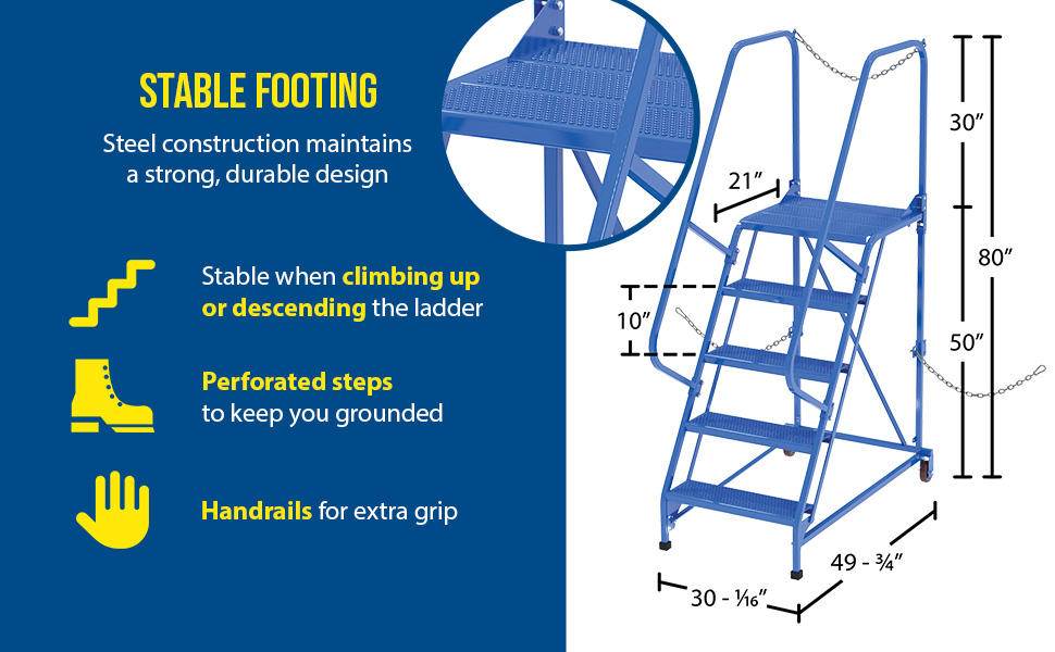 Semi-Trailer Access Ladders are for use getting into Semi-Trailers. Tilt the unit to allow for portability. Units roll on 4" poly-on-poly wheels. Constructed of square tubing framework which handles uniform capacities up to 350 lbs. Features 30" high removable hand railing, access chain, 21" deep top platform, and an industrial baked-in blue powder coat finish for toughness. Each step measures 24" wide by 7" deep and is spaced 10" apart. Climb Angle is 58 degrees. |