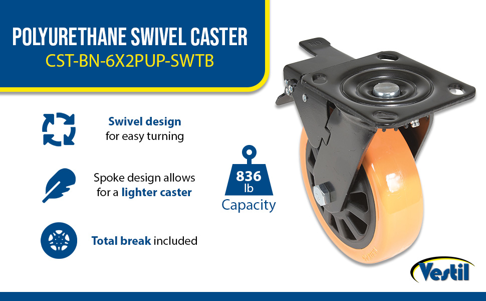 Polyurethane is ideal for most environments. It is resistant to a variety of chemicals, and produces an easy roll for ergonomic applications. It also provides good floor preservation and works effectively in both indoor and outdoor environments. The unique spoke design allows for a lighter weight caster with the same amount of capacity.