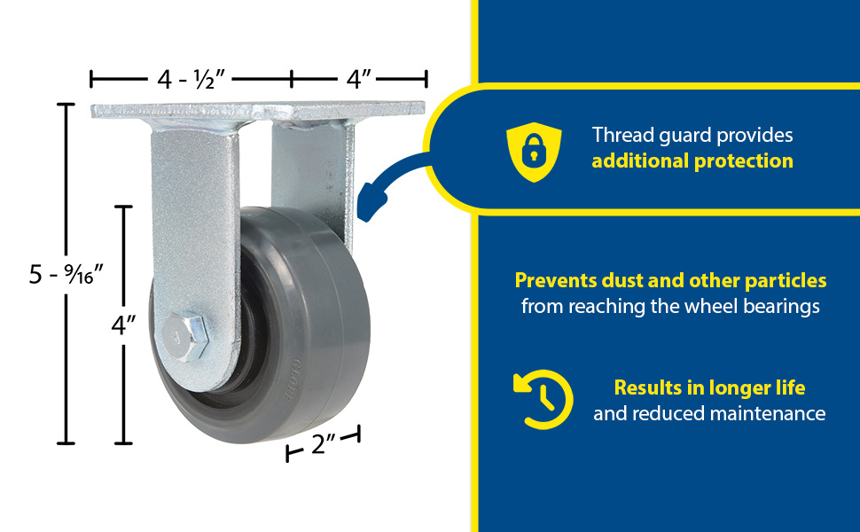Made from a soft non-marking rubber, the super muting caster provides one of the quietest, smoothest rolls in the market. the thread guard provides additional protection by preventing dust and other particles from reaching the wheel bearings, Resulting in longer life and reduced maintenance.