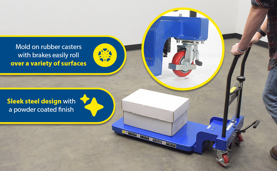 In areas of congestion a low profile scissor cart is a must. With a two speed foot pump, the platform is easily raised/lowered to the desired position. Not only is this design extremely efficient but also ergonomically friendly. With a raised steering handle the user can maintain a proper working posture during transit. The sleek steel design, with a powder coated finish for baked in added toughness, is simple to clean and limits needless scuffs or abrasions. Mold on rubber casters with brakes roll easily over a variety of surfaces.