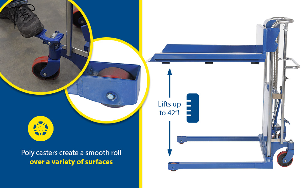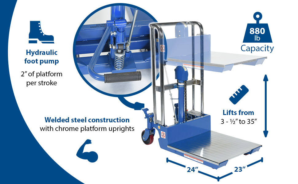 The Hefti-Lift units provide reliable powerful lifting when moving and positioning loads. The manual hydraulic foot pump yields 3/4" of platform travel per stroke, auto-shift models feature a two speed foot pump.The units roll smoothly on two rigid and two swivel poly-on-steel casters with foot operated brake. The units are designed of welded steel construction with chrome platforms and uprights (except model HYD-10-DA-SS) Each fork is 4-1/2"W x 2-1/2"H, the fork length is the same as the platform length. Overall fork width is 22". Not for use with pallets. Stainless Steel units are compact, lightweight, and capable of turning in a small radius when space is limited. A built-in automatic load check valve is included for improved safety. Model HYD-5-SS features a hydraulic foot pump, while model HYD-10-DA-SS comes with a dual acting manual hydraulic hand pump.