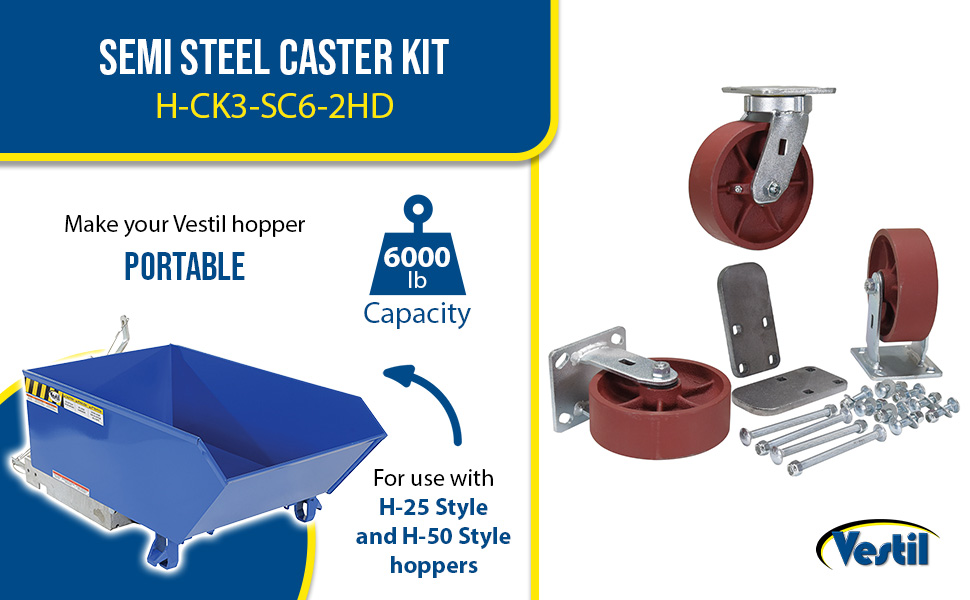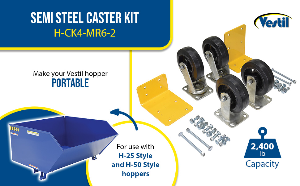 Transport loads with portable hoppers. The maximum weight capacity is the lowest weight capacity of either the hopper or the caster. Weight of hopper must be considered when calculating usable capacity. Sets include two (2) rigid, two (2) swivel casters. For the H series 1/4 and 1/2 cubic yard hoppers only three (3) casters are included, two (2) rigid and one (1) swivel, in addition to bolt on stabilizing legs for the back. Casters are bolted-on by utilizing the factory stamped hole in the fork tubes. Casters are shipped uninstalled to prevent freight damage.