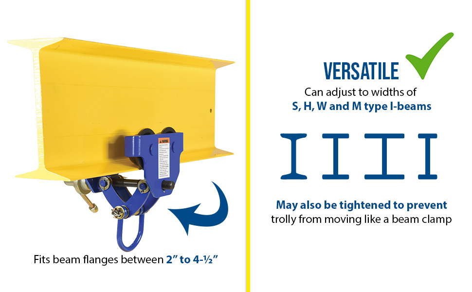 QIT-06These trollies are dependable, easy and safe to use. Designed to easily adjust to the width of virtually any S, H, W and M type I-beam. Width is adjusted with manual screw mechanism. Includes locking ring to prevent trolley width from changing accidentally. Manual screw mechanism may also be tightened to prevent trolley from moving (similar to a Beam Clamp). Each trolley includes four rollers with sealed bearings for long life. A lifting eye is located at the bottom of the trolley for attaching to a hoist (hoist sold separately). Steel construction and painted finish.