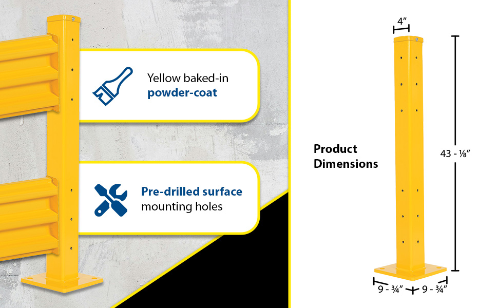 Create a modular system to protect equipment, inventory, and individuals from damage or injury with this highly visible powder coat yellow Structural Guard Rail. Triple ridge corrugated rails are constructed from 1/8" thick material, made for high impact resistance indoors or out. Posts are constructed of round corner 1/4" thick material. The steel base plate measures 10" square and is 5/8" thick. Bolts and washers are provided with individual rail sections. Concrete mounting kit is available separately. Provide a strong barrier with easy accessibility with our Drop-In Style rails. Slide rail sections into post saddles for simple assembly. Each Drop-In Style rail section includes two brackets. Bolt-On Style rails are designed for permanent installation. Models GR-TP-YL and GR-TP-GAL posts include mounting holes on all four sides for use in corners or center posts.