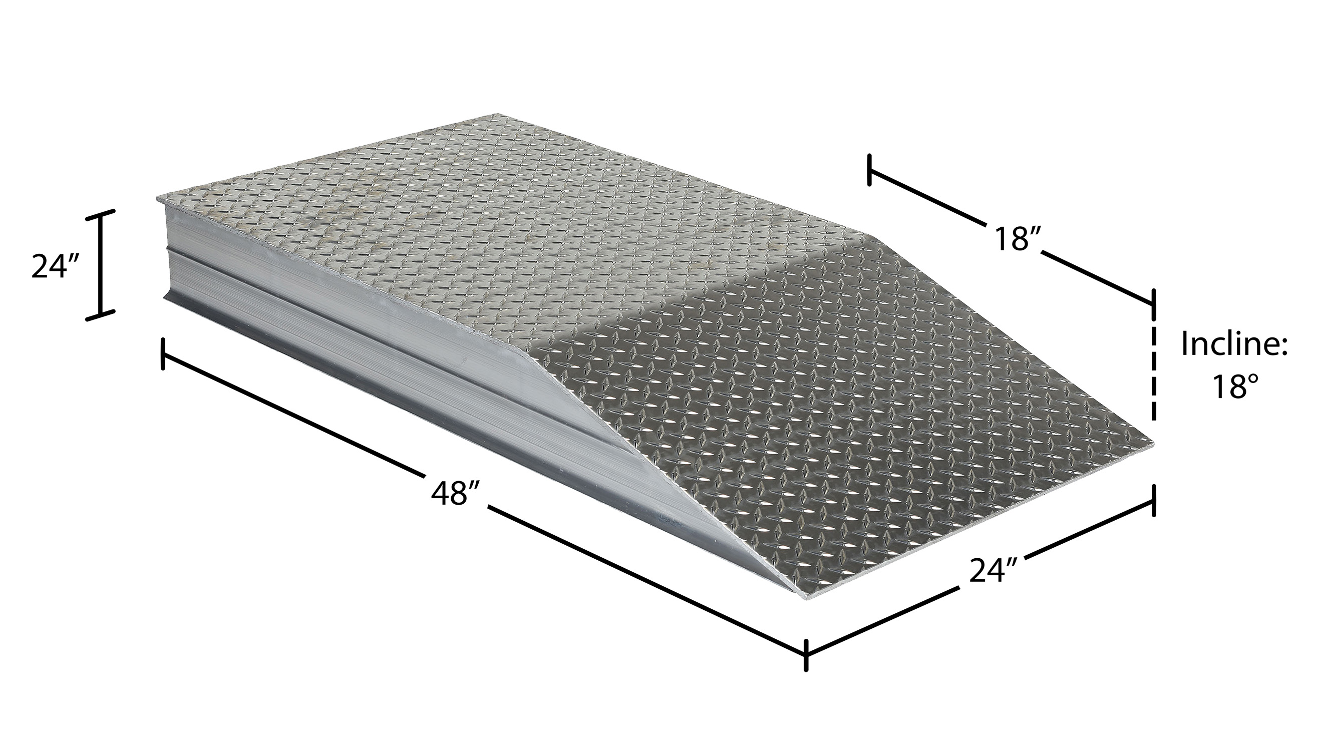 Aluminum Heavy Duty Wheel Riser 48 In. x 24 In. x 5-7/8 In. 30000 Lb. Capacity SilverElevate semi-trailers to loading docks for maximum serviceability during loading and unloading operations. Manufactured from heavy-duty aluminum tread plate for positive traction. All welded aluminum construction. 30,000 lbs. uniform capacity per pair (1/4" thick material). Wheel risers are designed to raise the trailer for secure loading and unloading.