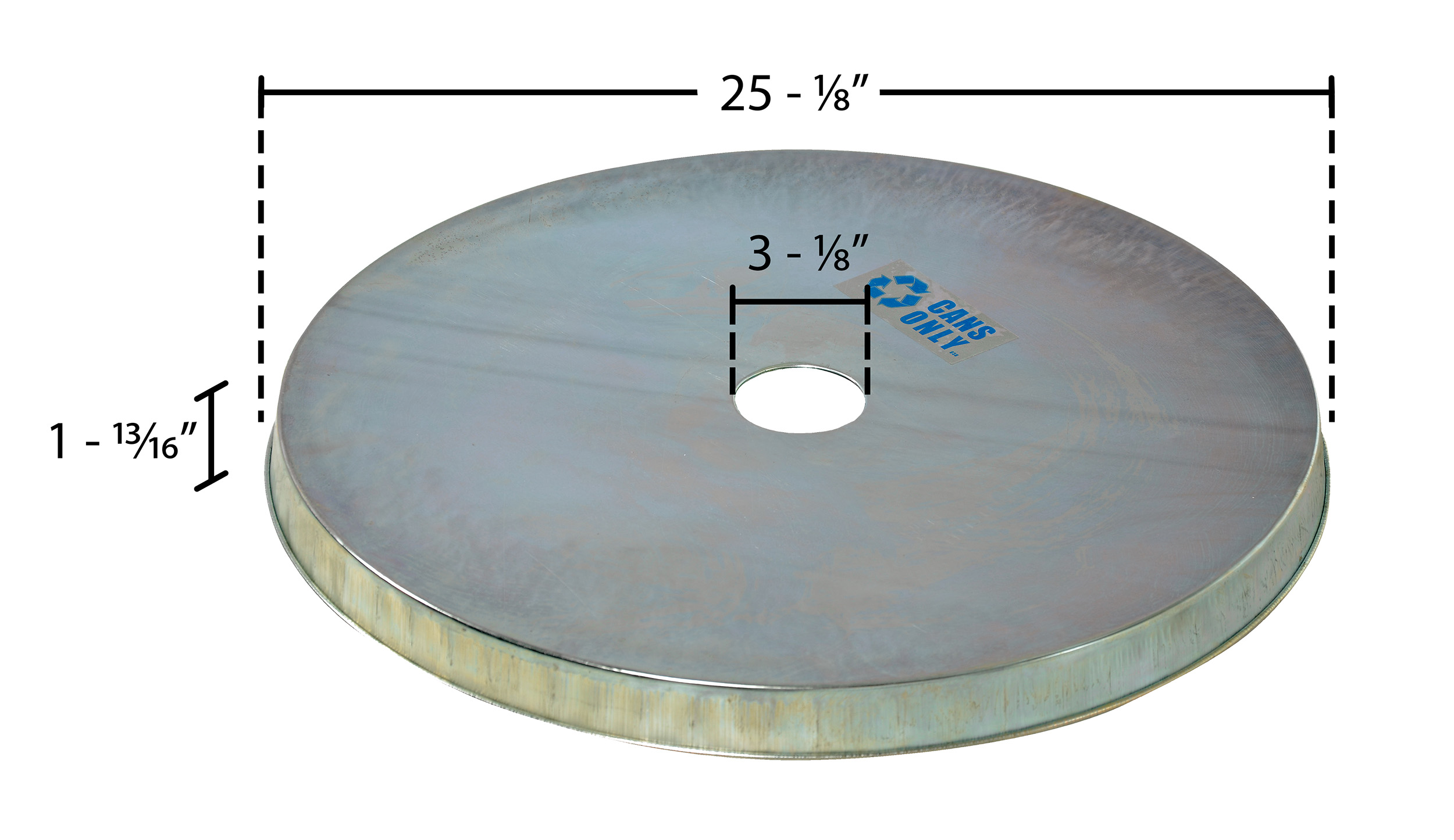 Galvanized Open Head Drum Cover Disposal Hole SilverThis Galvanized steel drum cover is for a fifty-five (55) gallon open head (tight head) drum. Manufactured from galvanized steel. Cover drum tops for added protection. Perimeter rim is beaded for safety. Recycling top includes a "cans only" decal.