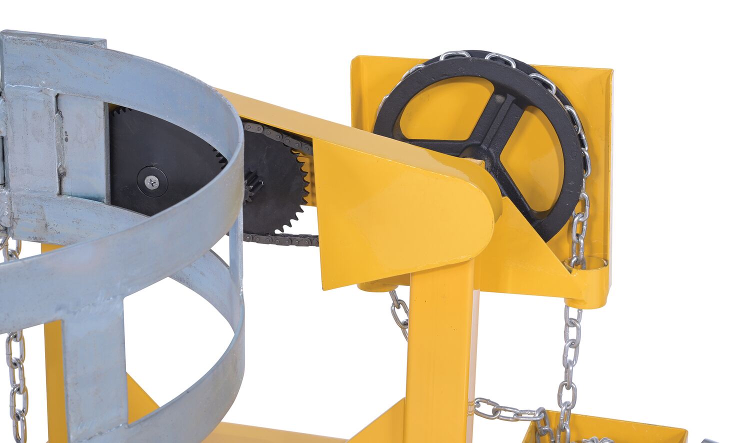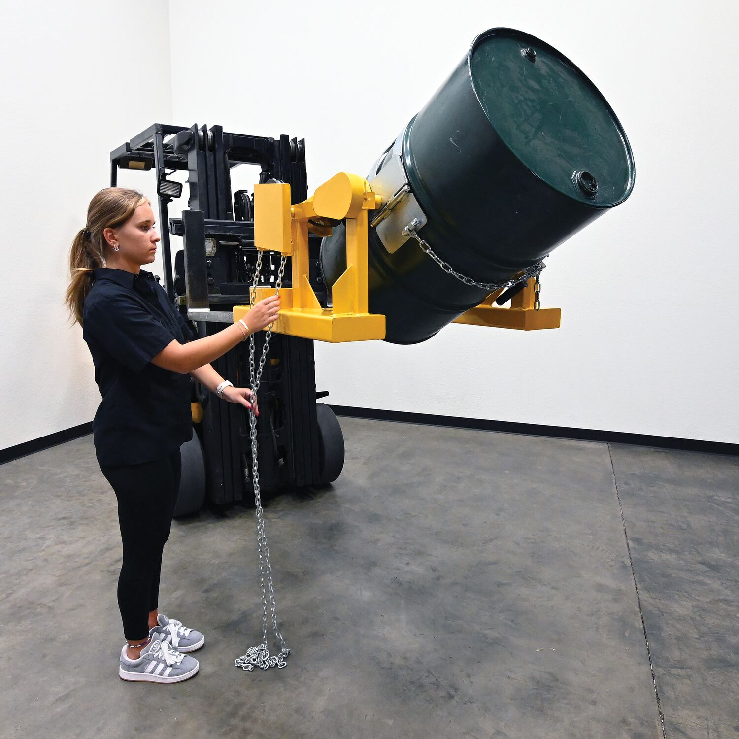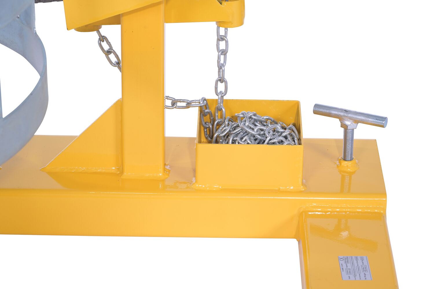 Steel Fork Truck Drum Carrier/Rotator For Steel Drums 55 Gallon 1500 Lb. Capacity YellowThis Fork Truck drum carrier/rotator allows you to easily transport and rotate steel drums using a fork truck. Drums are held securely in place by a durable chain locking system. Carrier/rotator is provided with a chain to allow the drum to be rotated from the fork truck operator's seat. Bung nut wrench is also included for opening and closing drums. Drum must be full to rotate at rated capacity. Complies with OSHA Gen. Industry rule 1910.178; ANSI B56.1.