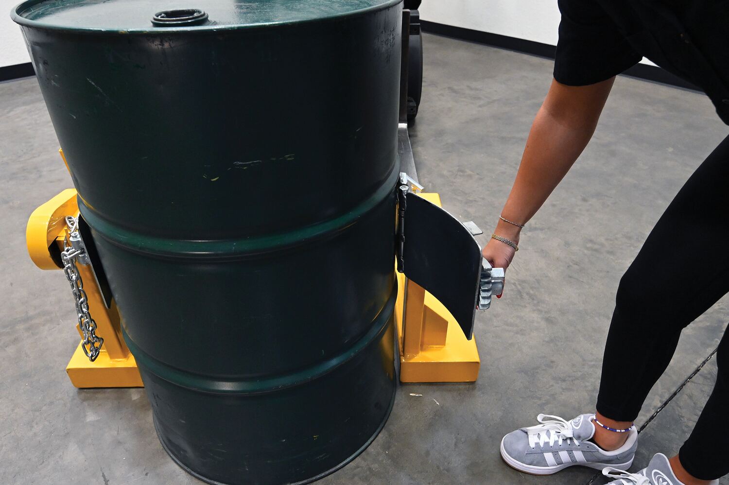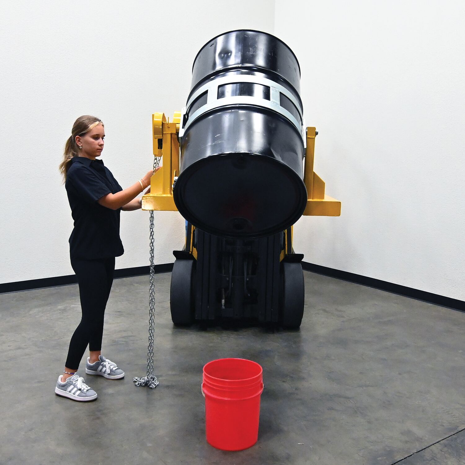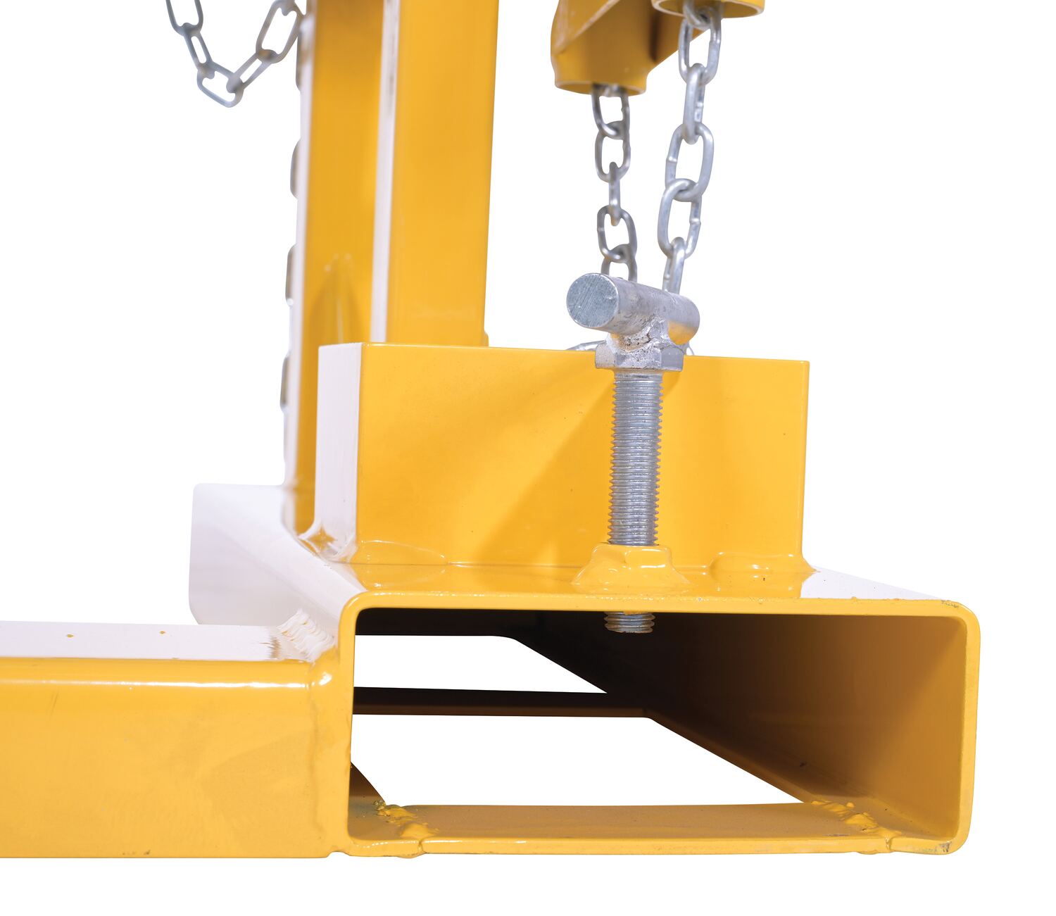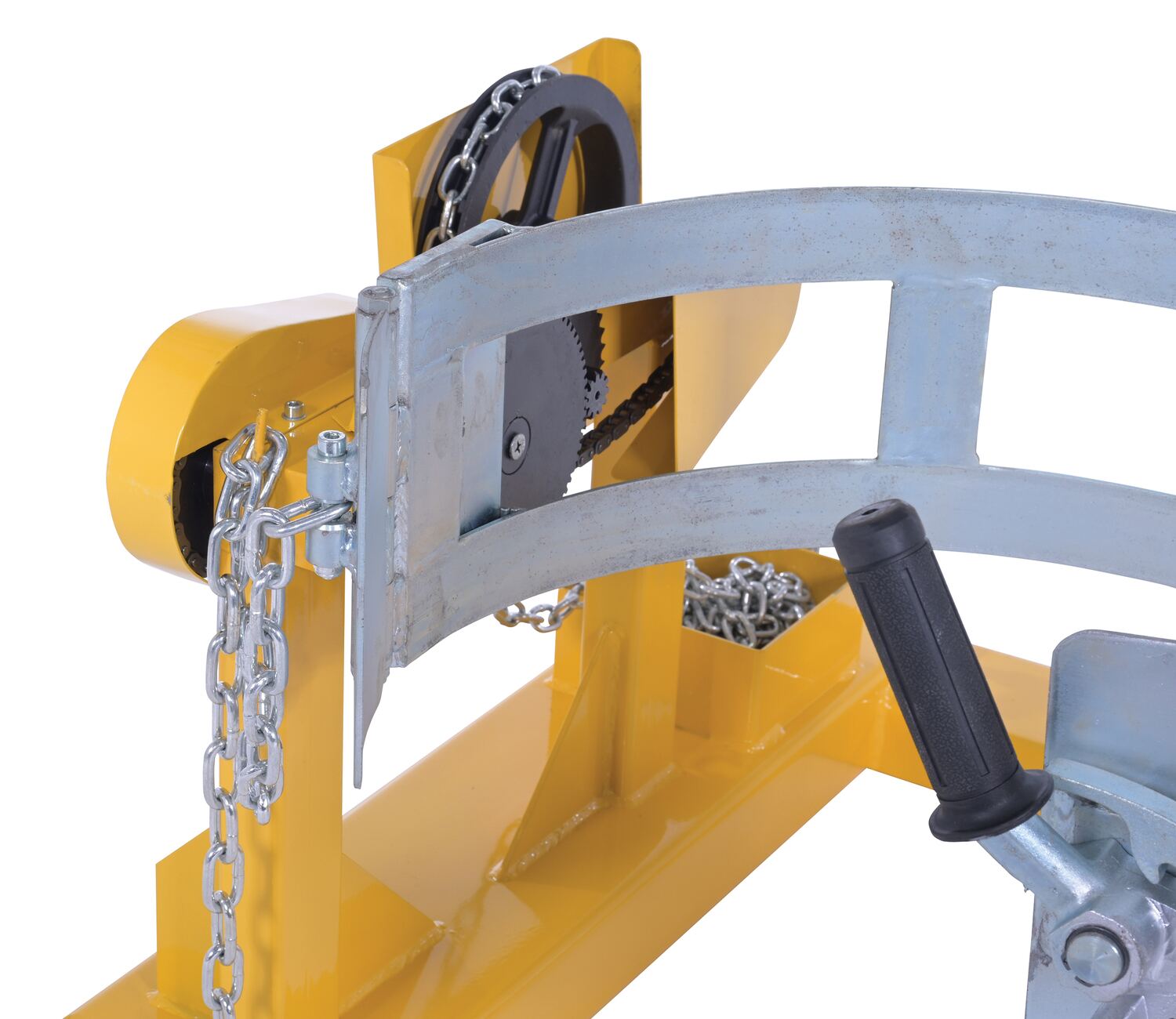 Steel Fork Truck Drum Carrier/Rotator For Steel Drums 55 Gallon 1500 Lb. Capacity YellowThis Fork Truck drum carrier/rotator allows you to easily transport and rotate steel drums using a fork truck. Drums are held securely in place by a durable chain locking system. Carrier/rotator is provided with a chain to allow the drum to be rotated from the fork truck operator's seat. Bung nut wrench is also included for opening and closing drums. Drum must be full to rotate at rated capacity. Complies with OSHA Gen. Industry rule 1910.178; ANSI B56.1.