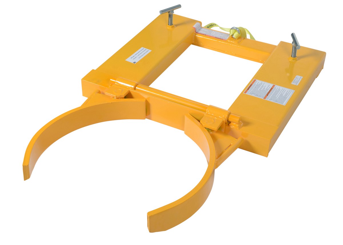 Steel Deluxe Single Drum Gripper 55 Gallon 43-3/16 In x 28 In x 7-1/8 In 1500 Lb. Capacity YellowThe drum gripper makes it easy to pick up one open head (with lid installed and secured) and closed head steel drum without leaving the seat of the fork truck. Simply slip the forks into the fork pocket, fasten the safety restraint and the drum gripper is ready to go. The knuckle gripping system is lowered around the drum, gripped tightly, and then lifted into the air. Drum is automatically released by lowering the forks. Features hinged folding design for storage and adjustable-width arms for use with steel drums. Safety restraint included. Welded steel construction. Powder coat finish.