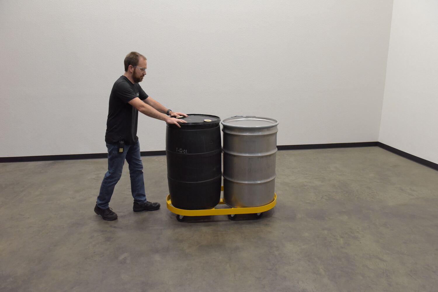 Steel Double Drum Dolly with Glass Filled Nylon Casters 45 In. x 45 In. x 39 In. Two 55 Gallon 2000 Lb. Capacity YellowA double drum cart is a revised look on an old classic. The double drum cart allows the user to transport two drums in a single load. This not only helps to save time, but it also minimizes the manual labor of handling individual drums. Six glass filled nylon casters add maneuverability and durability when traversing a variety of surfaces. Baked in powder coat finish for added long lasting toughness.