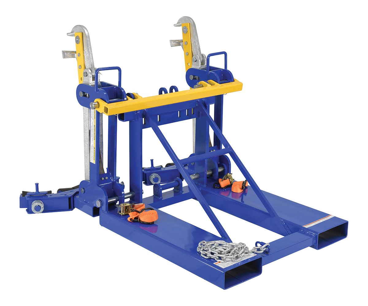 Steel Automatic Eagle Beak 2 Drum with Rollers 1,000 Lb. Capacity BlueThis time tested and proven design allows a fork truck operator to easily secure, move, and release drums without leaving the seat of the fork truck. For use with open (lid installed and secured) and closed head steel, plastic, and fiber drums with a top lip strong enough to support the weight of the drum. Includes safety restraint to secure unit to the fork truck. Welded steel construction. Baked-in powder-coated toughness. A ratchet strap is supplied to secure the drum to the unit when traveling over rough terrain.