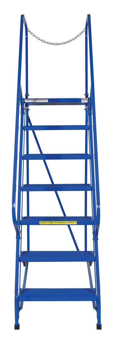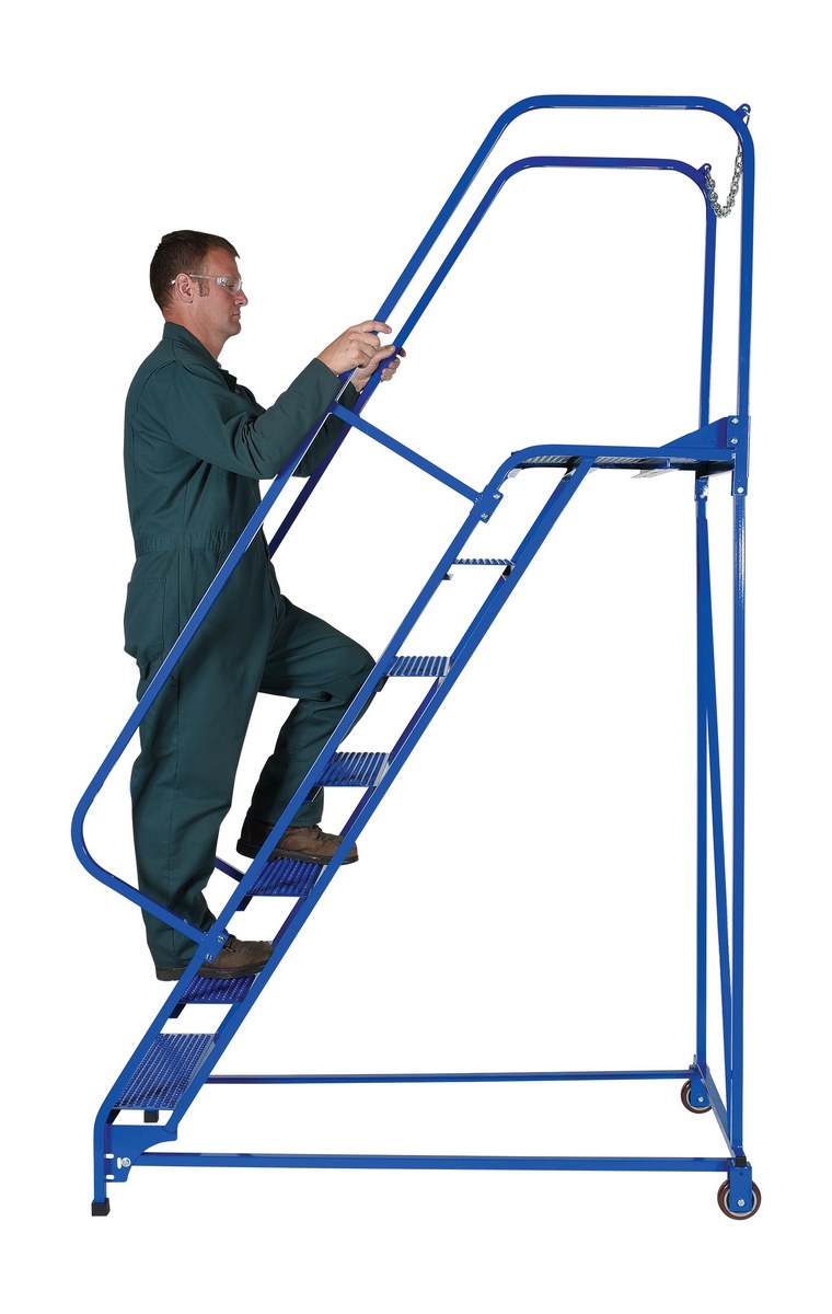 Steel Maintenance Ladder 58 Degree 7 Perforated 24 In. Step Width 350 Lb. Capacity BluePortable maintenance ladder for use around a variety of stores and inventory rooms. Constructed of square tubing framework, which handles uniform capacities up to 350 lbs. hand railing provides user safety while ascending or descending the unit. Distance between steps is 10". Powder coated finish for baked in added toughness.