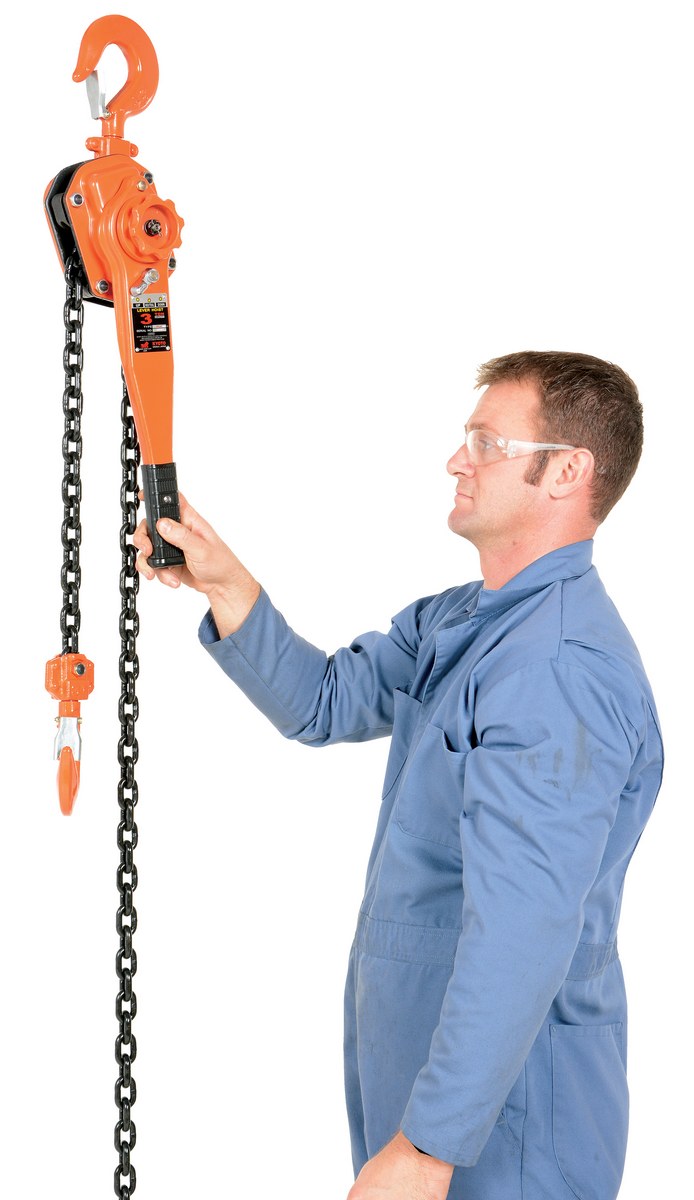 Steel Professional Lever Hoist 20 Ft. Lift Height 6,000 Lb. Capacity OrangeThis versatile professional lever hoist is suitable for lifting, pulling, and lashing the load in many applications. Ideal for confined spaces and can be used at any angle. This lever hoist has a wider hardened ratchet gear, high impact restraint gear case and brake cover. Free wheeling in neutral position serves to quickly attach the load or pull the chain thru the hoist in both directions. With an alloy chain for more strength and less weight. Upper and lower swivel hooks with deformation indicators. Minimum braking load is four (4) times of rated capacity. Fully enclosed brake system. Every unit is issued with an individual test certificate.