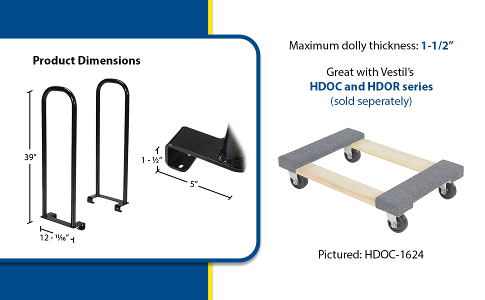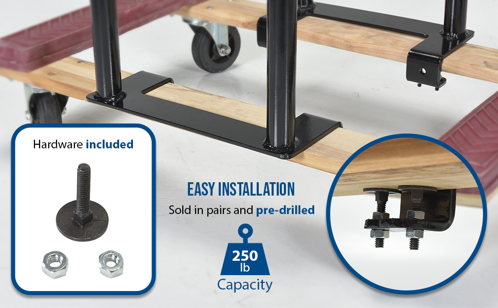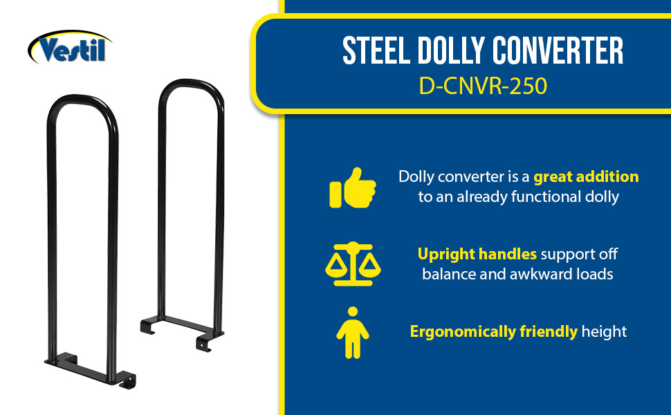 Dolly Converter is a great addition to the already functional dolly. The upright black handles support off balance and awkward loads, as well as give an ergonomically friendly height to the dolly. The units are sold in pairs and are pre-drilled. Hardware is included.