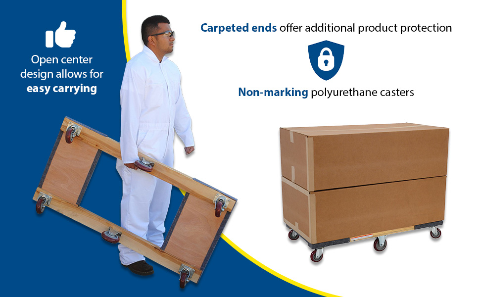 These oversized hardwood dollies are great for moving larger items. Manufactured from durable 3/4" thick plywood components. Units roll on non-marking polyurethane casters. Capacity is 1,200 pounds.