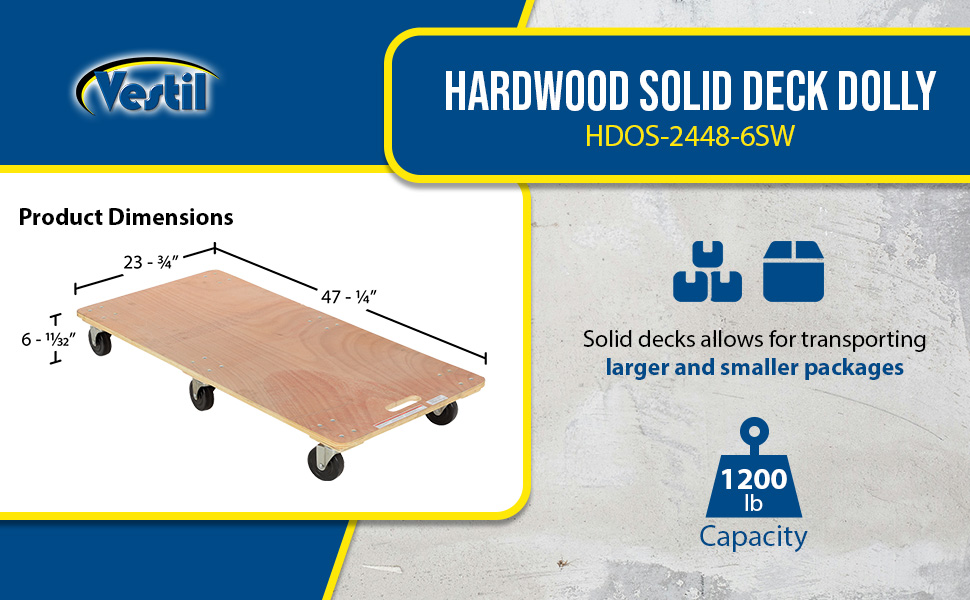 HDOS-2448-6SW HDOS-2448-6SWHardwood Solid Deck Dolly 47-1/4 In. x 23-1/2 In. x 6-1/4 In. 1200 Lb. CapacityUniform Static Capacity (lb.): 1,200