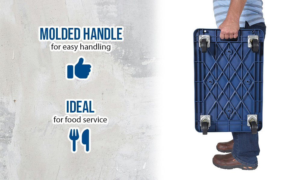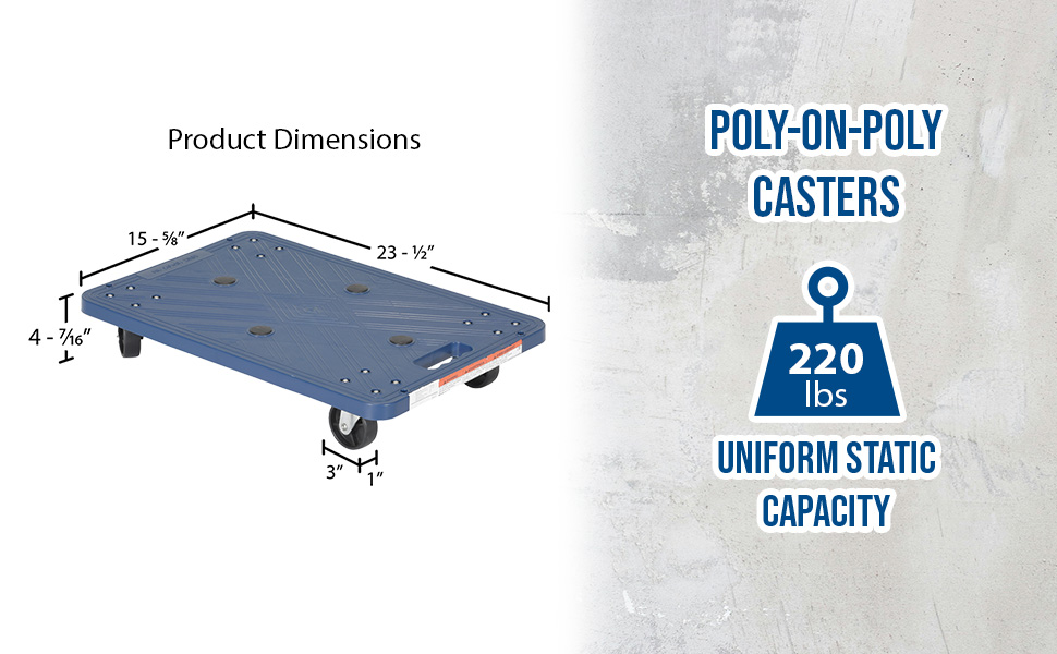 POS-1624 POS-1624Polyethylene Dolly 23-1/2 In. x 15-5/8 In. x 4-7/16 In. 220 Lb. Capacity BlueUniform Static Capacity (lb.): 220