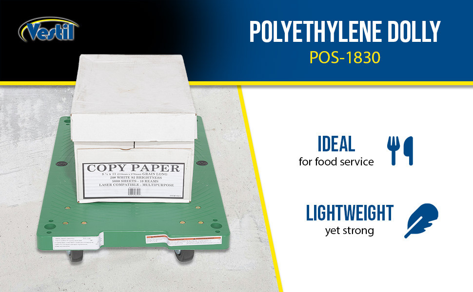 POS-1830 POS-1830Polyethylene Dolly 30 In. x 18 In. x 6-5/16 In. 500 Lb. Capacity GreenUniform Static Capacity (lb.): 500