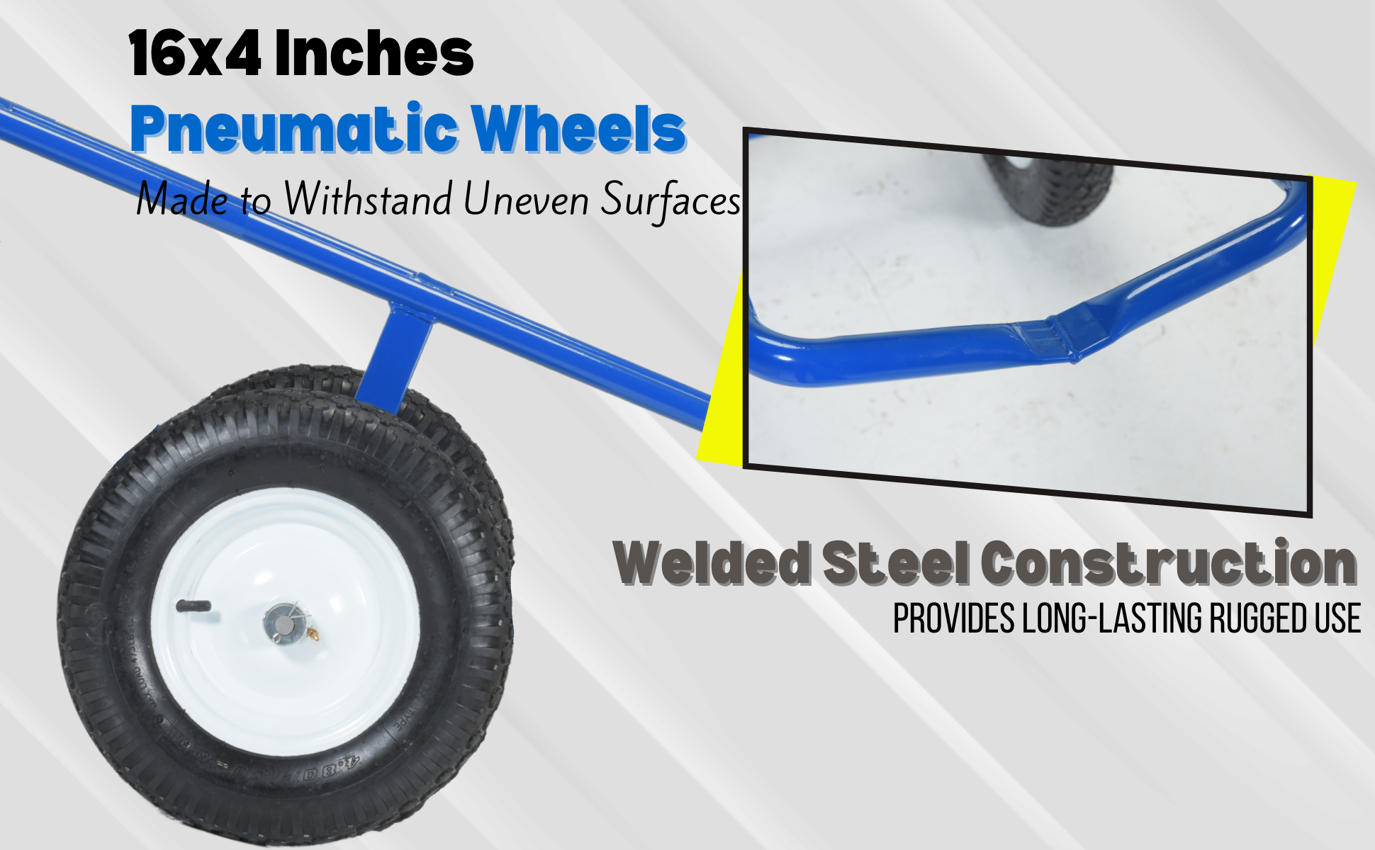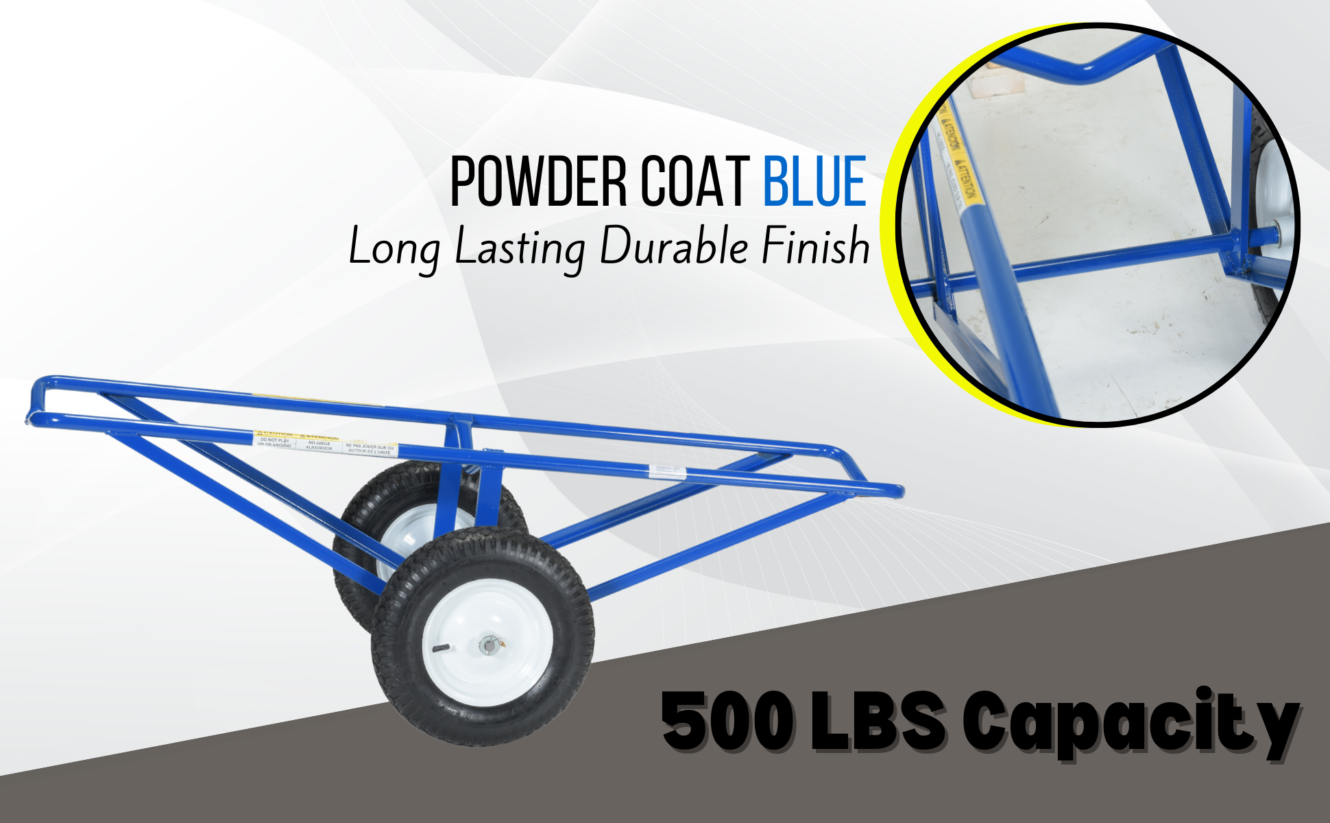 Each unit includes two 16" diameter by 4" wide wheels. Uniform capacity 500 lbs. Welded steel construction with baked in powder coat blue finish.