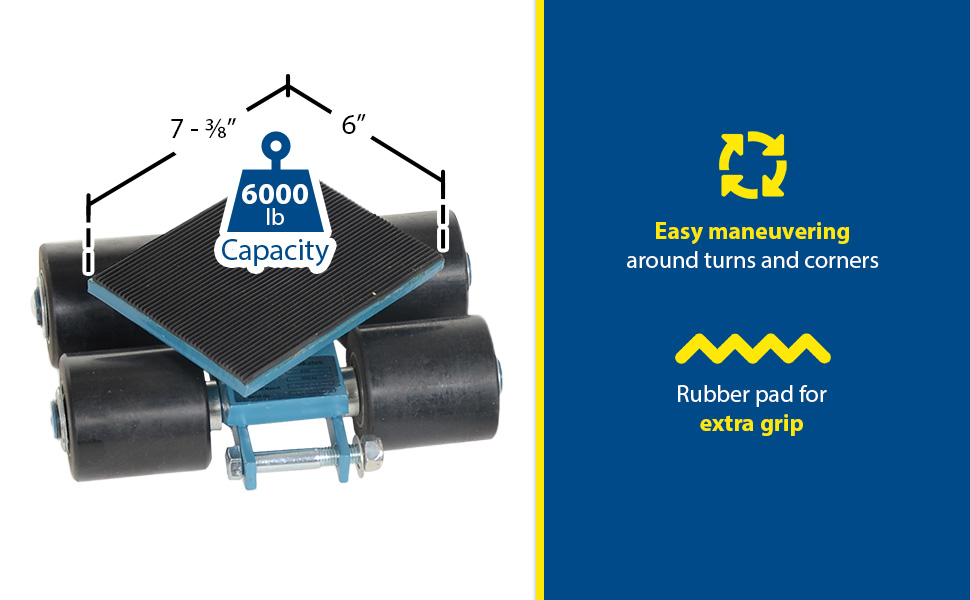 | Steel Multi Direction Machinery Skate 12 In. Length x 12 In. Width x 4-7/16 In. Height 6,600 Lb. Capacity Blue and Gray | Uniform Static Capacity (Lbs.): 6,600 Roller Material: Poly on Steel | 74 |