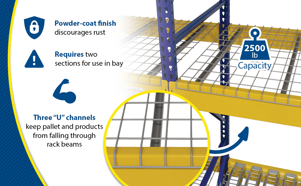 Provide maximum support at minimum cost. The three 13 gauge "U" channels keep pallet and products from falling thru rack beams. Fits 1-1/2" step beam. Uniform load capacity is 2,500 lbs.