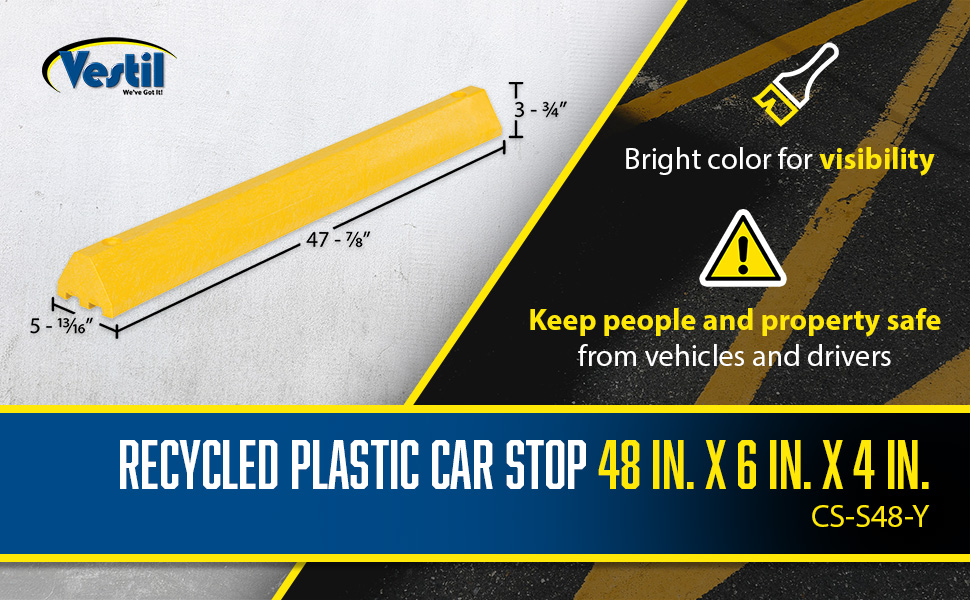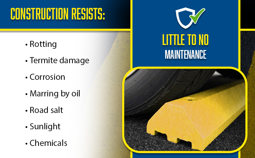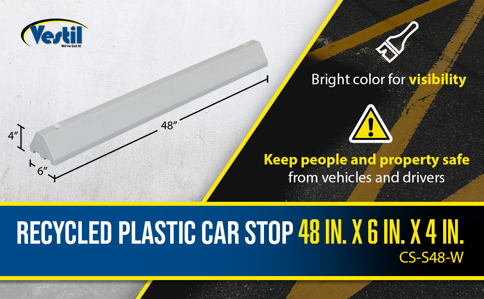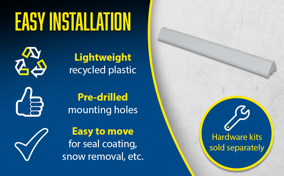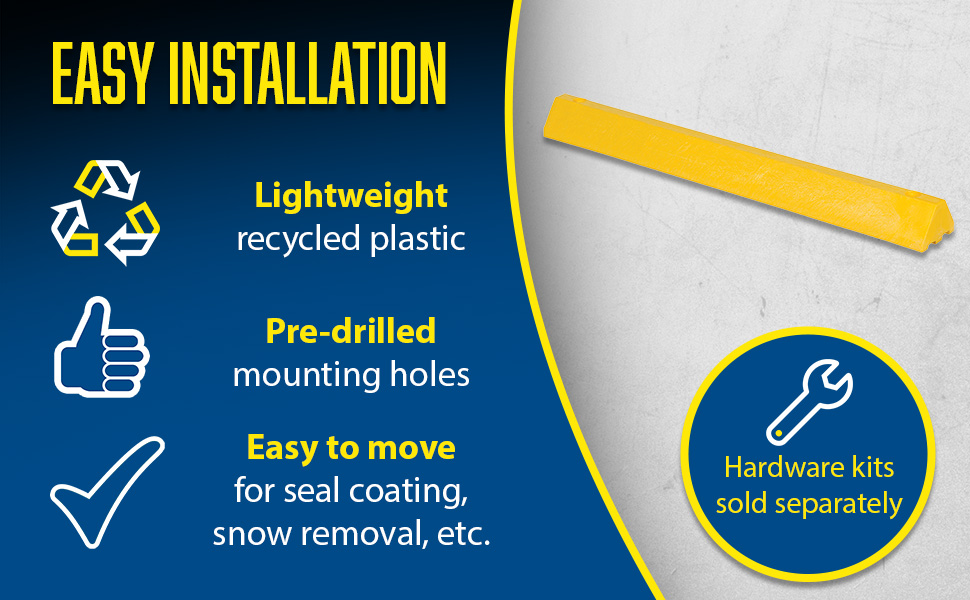 Protect people and property from drivers in dangerous areas. Constructed of lightweight recycled plastic. One person installation. Can be removed for seal coating, snow removal, or change of location. Resists marring by oil, road salt, sunlight, and chemicals. Resists rotting, termite damage, and corrosion. No costly painting or maintenance. High-visibility color enhances driver and pedestrian safety. Mounting holes are pre-drilled for a quick installation process. Hardware kits are available separately.