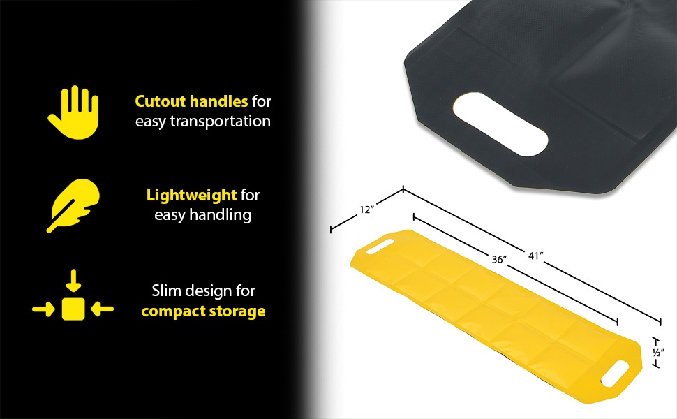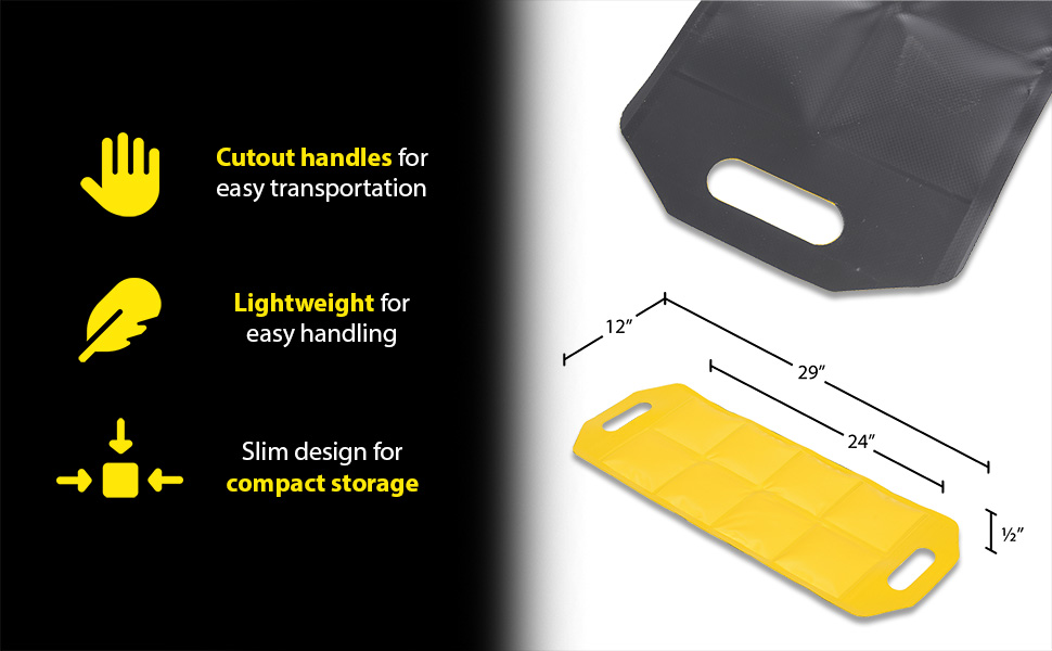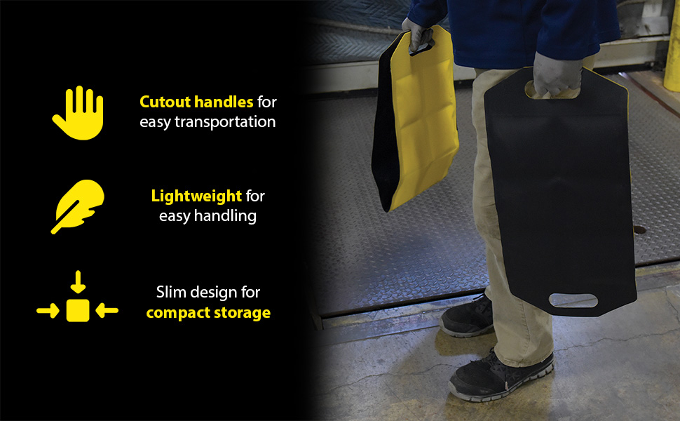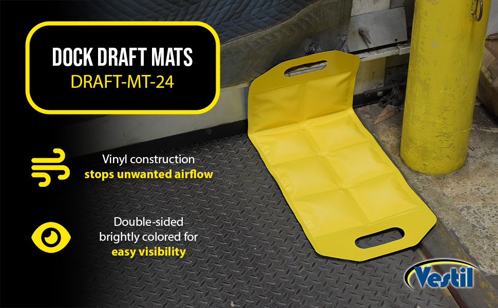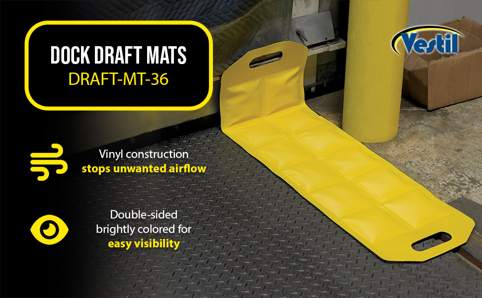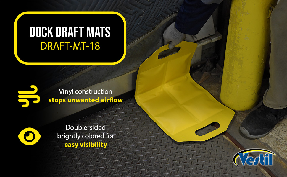 Dock Draft Mats are the perfect accessory for loading docks. A mat is a simple way to stop unwanted air flow, while not inhibiting the functionality of the dock. Cutout handles are included on each end of the unit for easy carrying maneuvering between areas. Lightweight material for simple handling. Perfect for reducing outside air flow. Slim design for compact storage when not in use. Brightly colored for clear visibility.