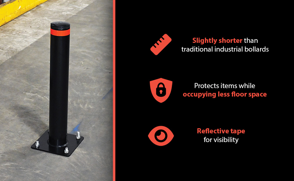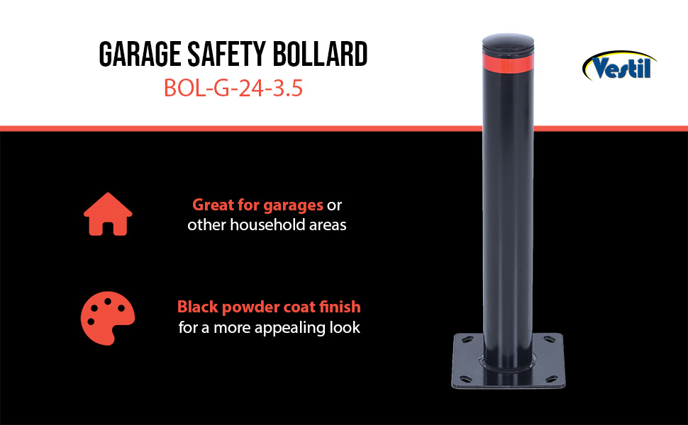 A Garage Safety Bollard can be used both to protect expensive equipment in garages or other household areas. With a slightly smaller standing height than traditional industrial bollards, this bollard style protects the items at hand while occupying a reduced amount of valuable floor space. A black powder coat finish provides the unit with a smooth surface while also giving it a sleek look that won't take away from the ambience of the room. Mounting holes are pre-drilled for a quick and easy installation to a variety of surfaces.