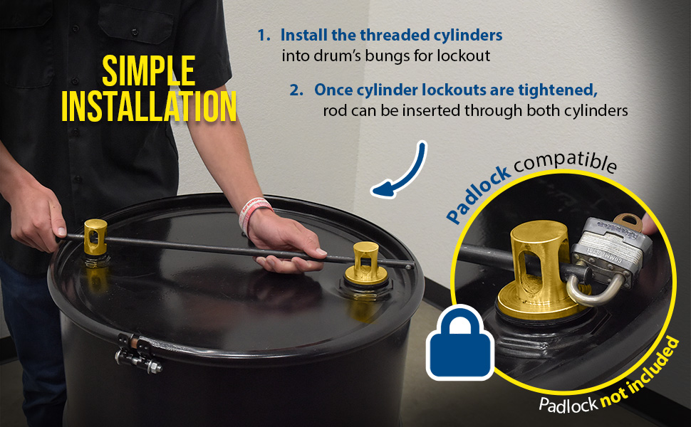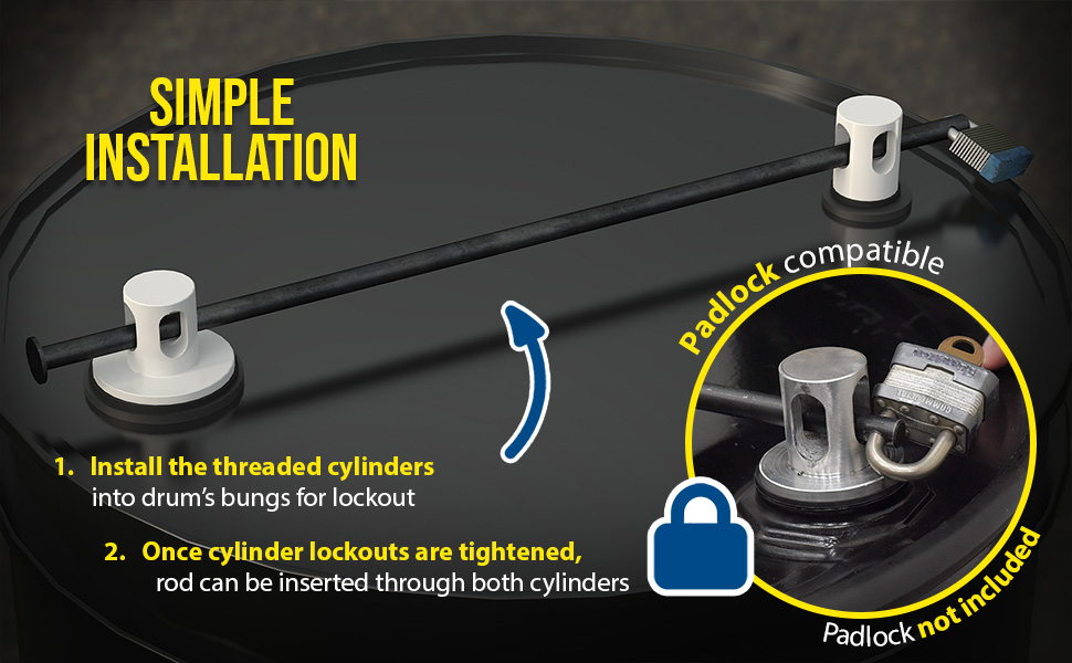 A double drum lock is the perfect solution to keeping the contents of drums safe and secure. These double drum locks are a simple design that utilizes the bungs of the drum to position threaded cylinders for lockout. Once the cylinder lockouts are tightened and in the correct position a rod can then be inserted through one of the port holes of both cylinders. The rod design has an open ended frame for allowing padlock to pass through for complete lockout. Padlock not included. Available in Aluminum, Brass and Plastic.