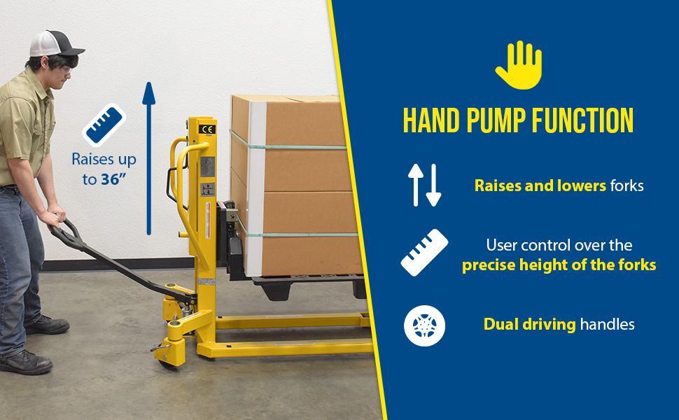 A Lift and Tilt pallet truck is an outstanding addition to a variety of production environments. The hand pump lever functionality gives the user control over the precise height movements of the forks. With a wide service range, items both large and small can be loaded and unloaded at a height that best fits the users preference. For items that may need added stability, the tilting function is available. The tilting function can be used up to 20 degrees tilt for extra steadiness. Steel construction with a powdercoat finish for added baked in toughness.