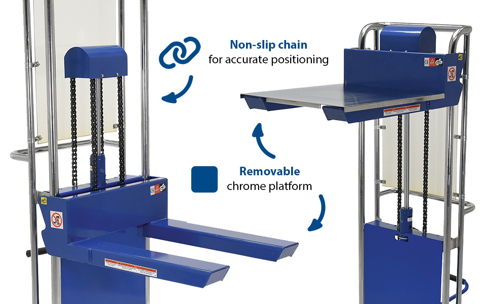 The Hefti-Lift units provide reliable powerful lifting when moving and positioning loads. The manual hydraulic foot pump yields 3/4" of platform travel per stroke, auto-shift models feature a two speed foot pump.The units roll smoothly on two rigid and two swivel poly-on-steel casters with foot operated brake. The units are designed of welded steel construction with chrome platforms and uprights (except model HYD-10-DA-SS) Each fork is 4-1/2"W x 2-1/2"H, the fork length is the same as the platform length. Overall fork width is 22". Not for use with pallets. Stainless Steel units are compact, lightweight, and capable of turning in a small radius when space is limited. A built-in automatic load check valve is included for improved safety. Model HYD-5-SS features a hydraulic foot pump, while model HYD-10-DA-SS comes with a dual acting manual hydraulic hand pump.