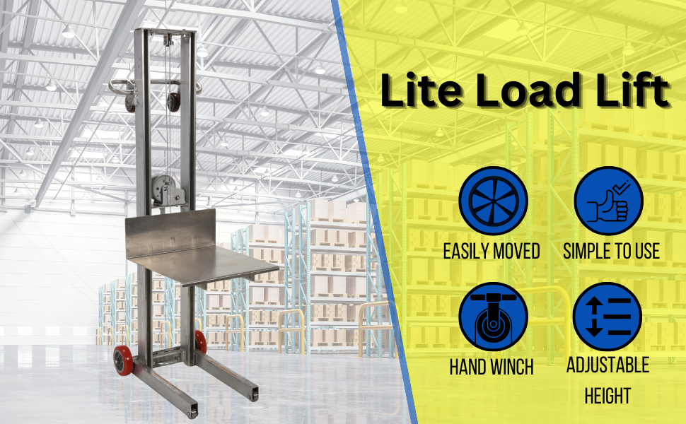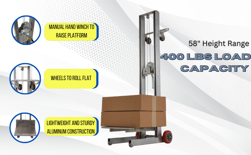 | Aluminum Lite Load Lift With Winch, Swivel Casters and Manual Floor Lock 24 In. x 20 In. Platform 400 Lb. Capacity Silver | Uniform Capacity (lb.): 400 Platform Width (in.): 24 | 141 |
