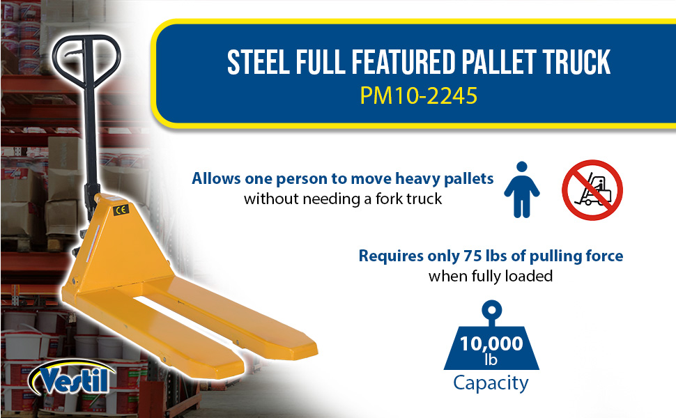 | Steel Full Featured Pallet Truck 58 In. x 22-3/4 In. x 48 In. 10000 Lb. Capacity Yellow | Uniform Capacity (lb.): 10000 Overall Fork Width (in.): 22-3/4 | 423 |