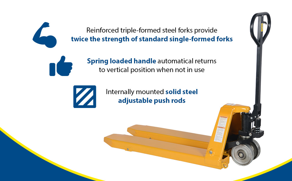 | Steel Full Featured Pallet Truck 27 In. x 48 In. 5500 Lb. Capacity Yellow | Uniform Capacity (lb.): 5500 Overall Fork Width (in.): 27 | 210 |