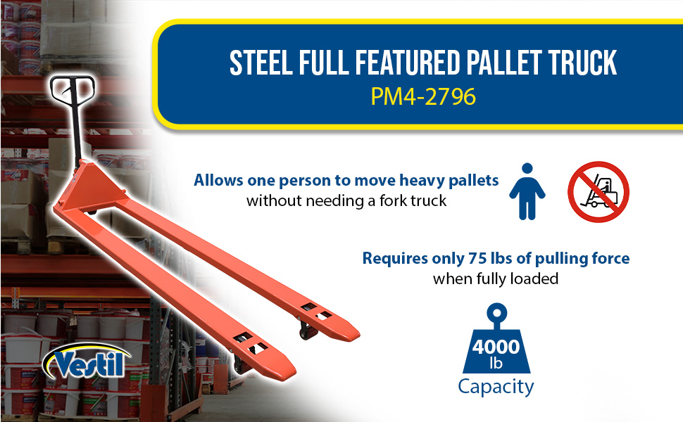 | Steel Full Featured Pallet Truck 84 In. x 27 In. x 48 In. 4000 Lb. Capacity Red | Uniform Capacity (lb.): 4400 Overall Fork Width (in.): 27 | 264 |