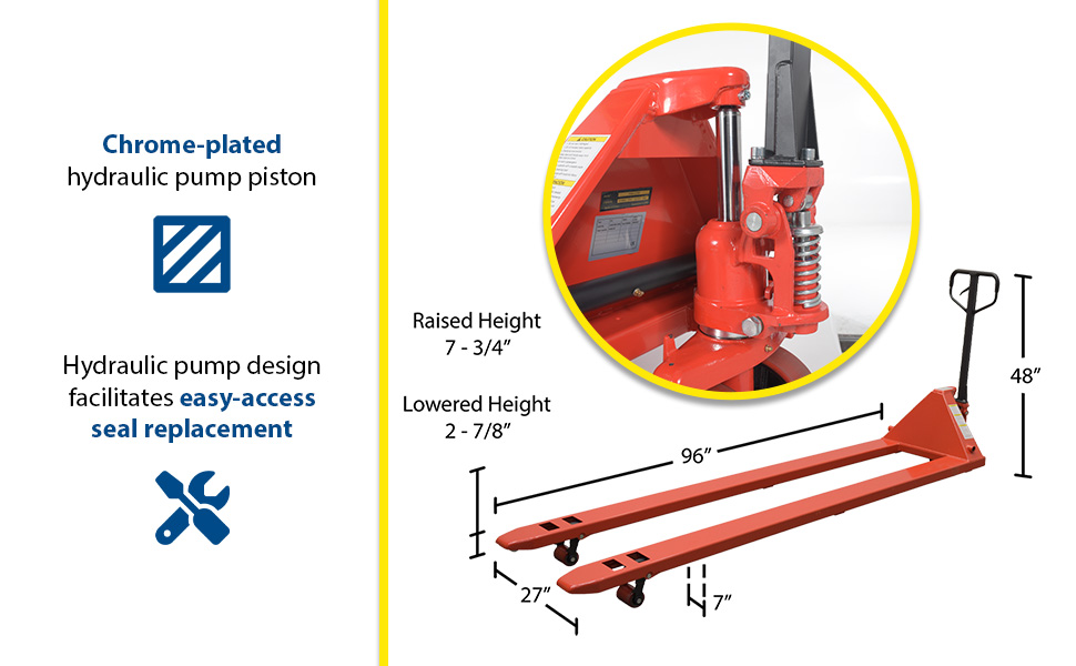 | Steel Full Featured Pallet Truck 27 In. x 48 In. 5500 Lb. Capacity Orange | Uniform Capacity (lb.): 5500 Overall Fork Width (in.): 27 | 210 |