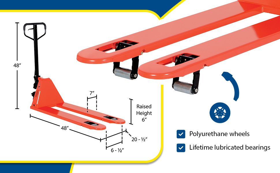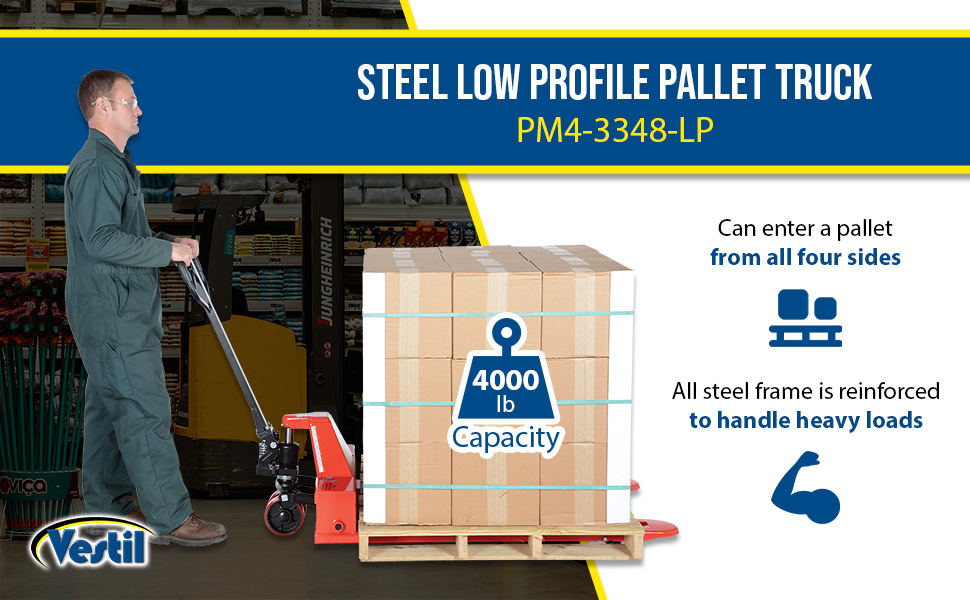 The Low Profile Pallet Truck enters pallets from all four sides. All steel frame is reinforced to handle 4,000 lb. capacity loads. Individual fork width is 7" wide. Wide loop control handle with lift, neutral, and lower functions provides fingertip control. Lifetime lubricated bearings. Hydraulic system has hard chrome plated pump piston with polyurethane seals. Suspension system has a heavy-duty thrust bearing. Complete with adjustable push rods, polyurethane wheels, steel load rollers and red baked-in powder-coated toughness.