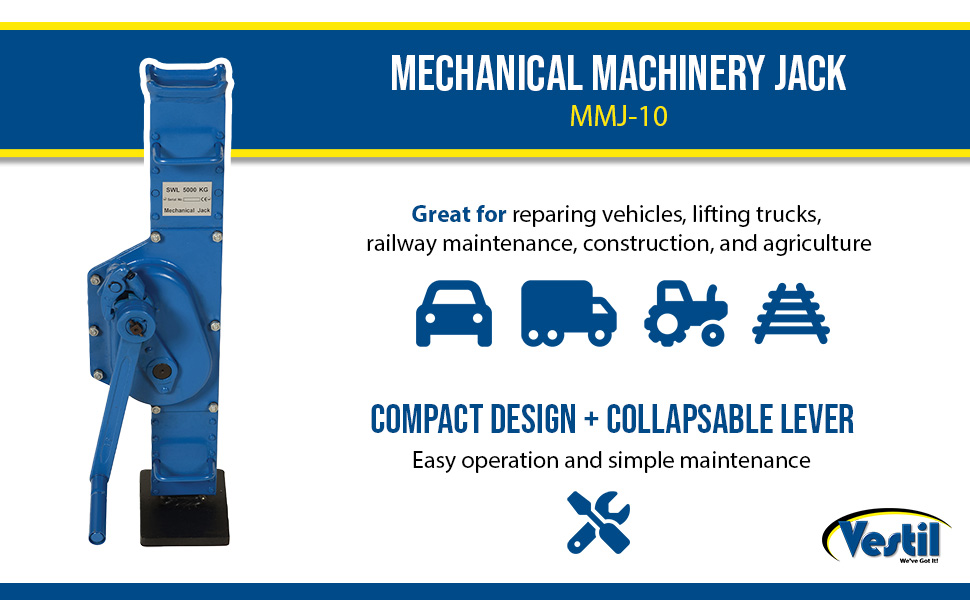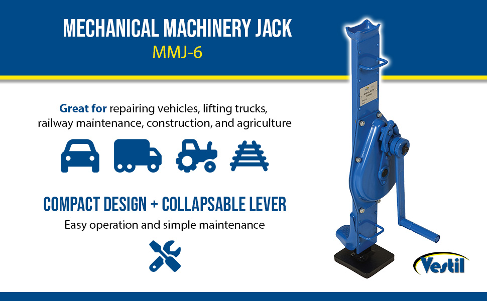 Mechanical Machinery Jacks are good for repairing vehicles, lifting trucks, railway maintenance, construction, mining, and agriculture. Compact design with collapsible lever offers easy operation and simple maintenance. A self locking, anti-kickback operating lever reduces injuries. Standard features include: folding handle, two carrying handles and a large base plate. Lifting and lowering speed is controllable. No seals to leak. Will not drift down even after an extended period of time.