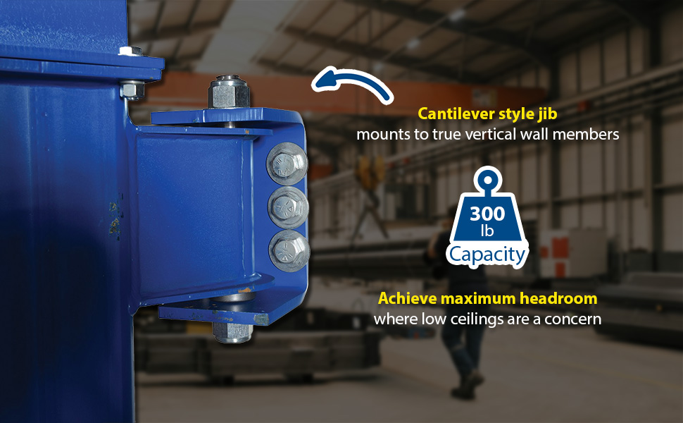 Designed to assist workers in the maneuvering of materials as well as achieving maximum headroom where low ceilings are of concern. This cantilever style mounts to true vertical wall members. Increase personnel productivity by lifting awkward materials. The overall I-beam length is 88" with a usable length of 80". Overall length of jib is 96-1/8". Unit rotates 180 degrees. Steel construction with painted blue finish. Hoists & Trollies can be ordered seperately.