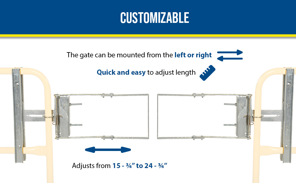 Customize your safety railings with Self-Closing Steel Gates. Gates can be mounted from the left or right with the included mounting hardware. Mount to horizontal rails that measure up to 2" diameter and are spaced 10" to 21" apart center to center. Choose from galvanized or yellow powder coat finish. Meets OSHA 1910.28(b)(3)(iv) requirements. (Railing and base not included.)