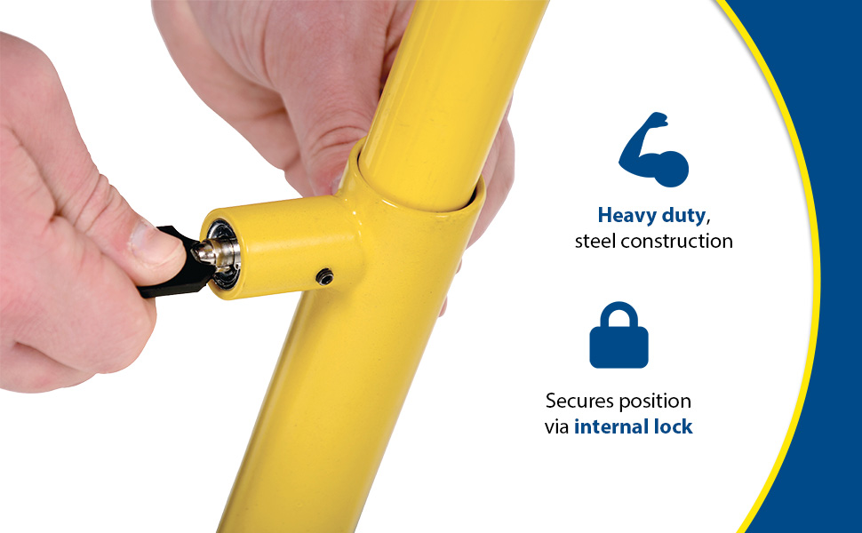 Secure an individual parking place from unwanted trespassing. Hinged parking hoop is constructed of cast steel with a UV resistant safety yellow baked-in powder-coated toughness on model PARK-P-38-S. Model PARK-P-38-ZN is made of steel construction. In the horizontal position the parking hoop allows free passage for cars and pedestrians. When engaged, the parking hoop is both a visual and safety barrier. Stands on three (3) hinged legs for better stability and resistance. Easy to operate. Secures in both open and closed position via internal lock, two (2) keys included. Reflective bands and six (6) 3/8" x 3" concrete anchors for securing bollard to concrete included.