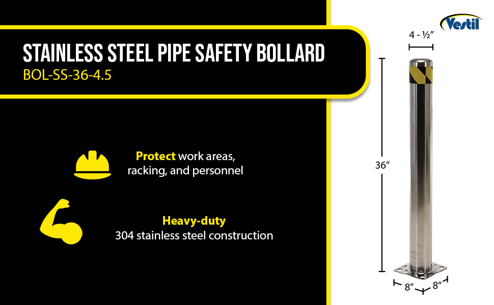 Bollards can be used both indoors and outdoors to protect work areas, racking and personnel. Steel caps are welded on. Base plate measures 8" x 8" and includes four (4) pre-drilled mounting holes. Mounting kits available. 304 stainless steel polished finish.