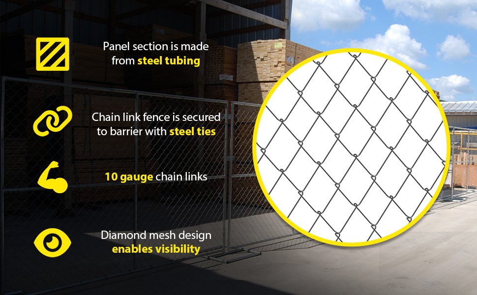 Designed for use as a temporary construction safety barrier. Welded steel construction with a galvanized finish. Barrier panel sections are made from 1-1/4" diameter steel tubing and includes one vertical and one horizontal brace. Ten (10) gauge chain link fence is secured to barrier with steel ties. Chain link fence openings are 2-3/8" x 2-3/8". Base unit includes two receiver posts allowing for the connection of two panels. Connectors are used for securing two (2) panel sections together.