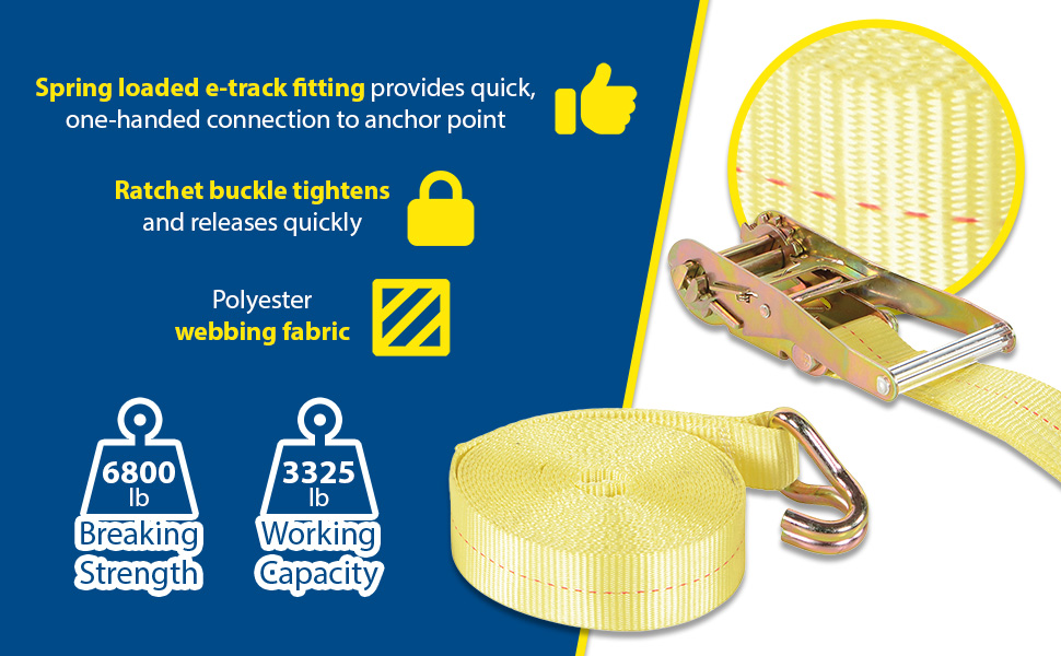 Guard against damages from slipping and shifting loads while transporting products. Spring loaded e-track fittings provide quick one-handed connection to anchor point. Both ratchet and cam buckle models tighten and release quickly. Tough strapping fabric is made of a polyester webbing.