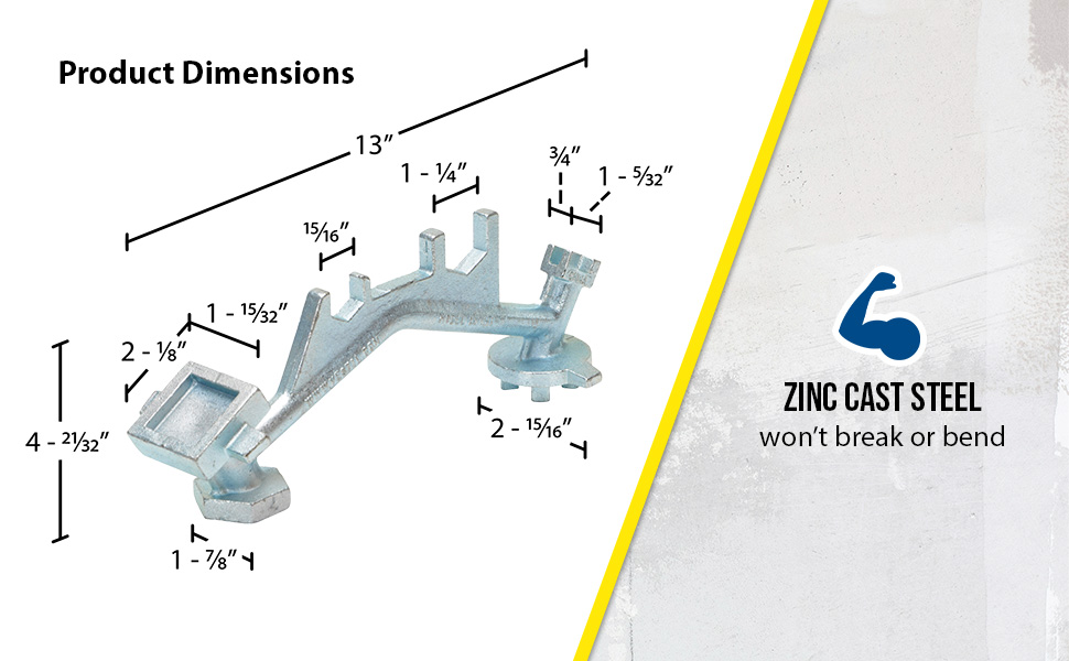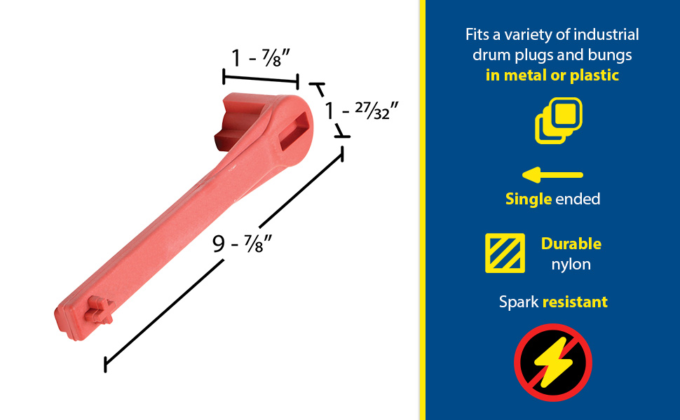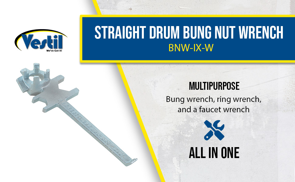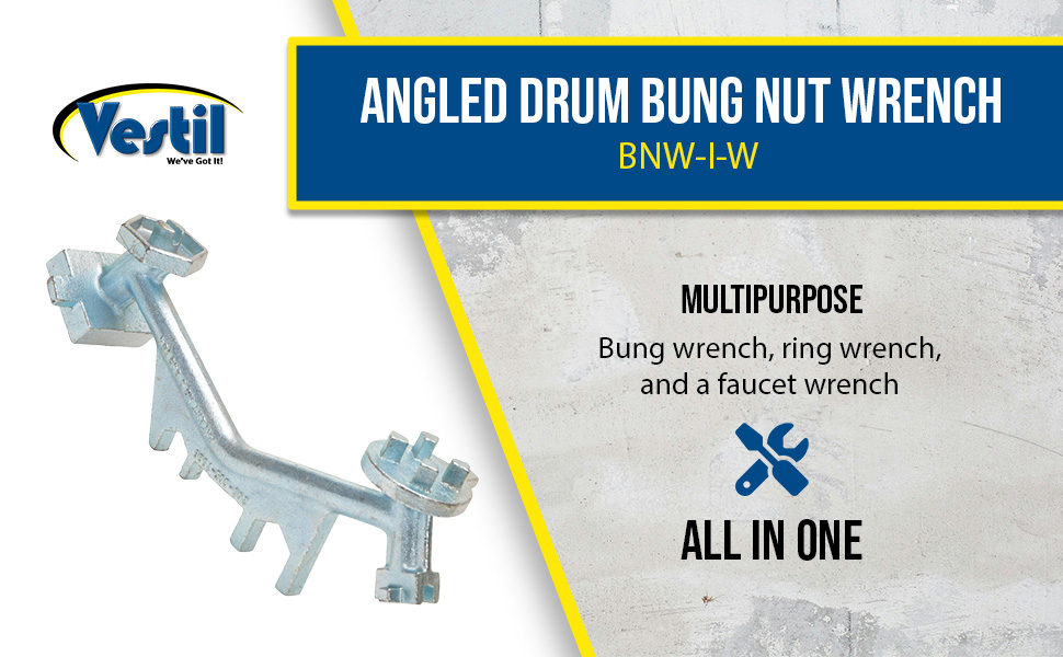 Specialty Bung Nut Wrenches are available in cast steel with polished zinc finish, non-sparking aluminum or non-sparking bronze alloy to meet many applications. These multipurpose drum tools not only open and close drum bungs or plugs, they also work as a bung wrench, ring wrench and faucet wrench all in one! Wrenches are universal in which they fit all types of industrial drum plugs and bungs in metal or plastic. The angled handles on model BNW-I-W and BNW-B-W protect knuckles in most positions. Durable cast steel does not bend, break or chip. Eliminate the need for extra tools with these multifunctional drum wrenches! Patent pending.