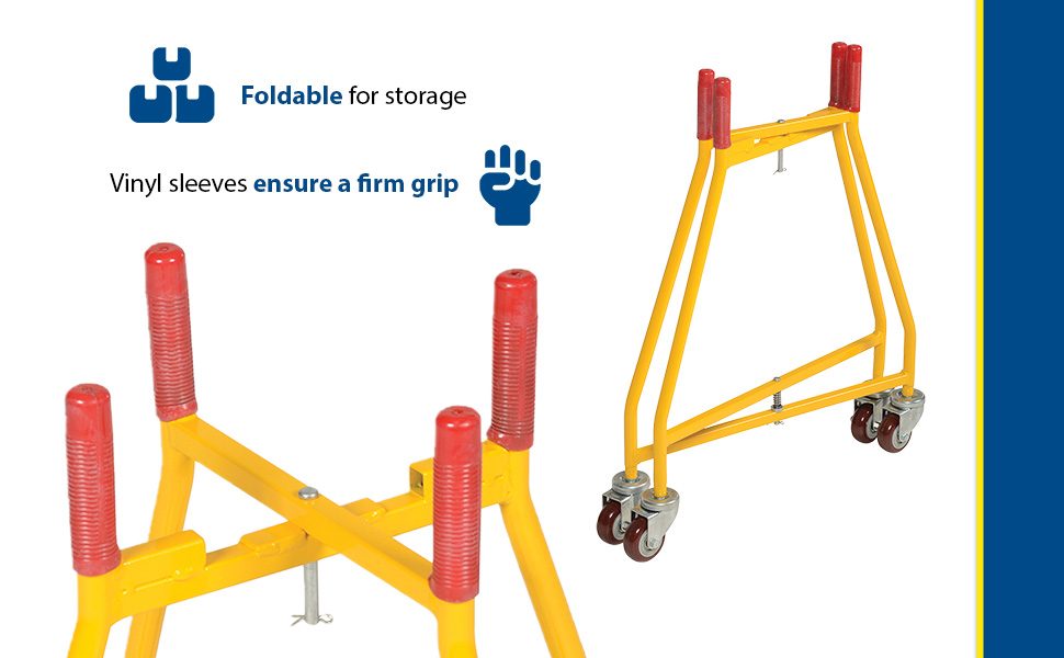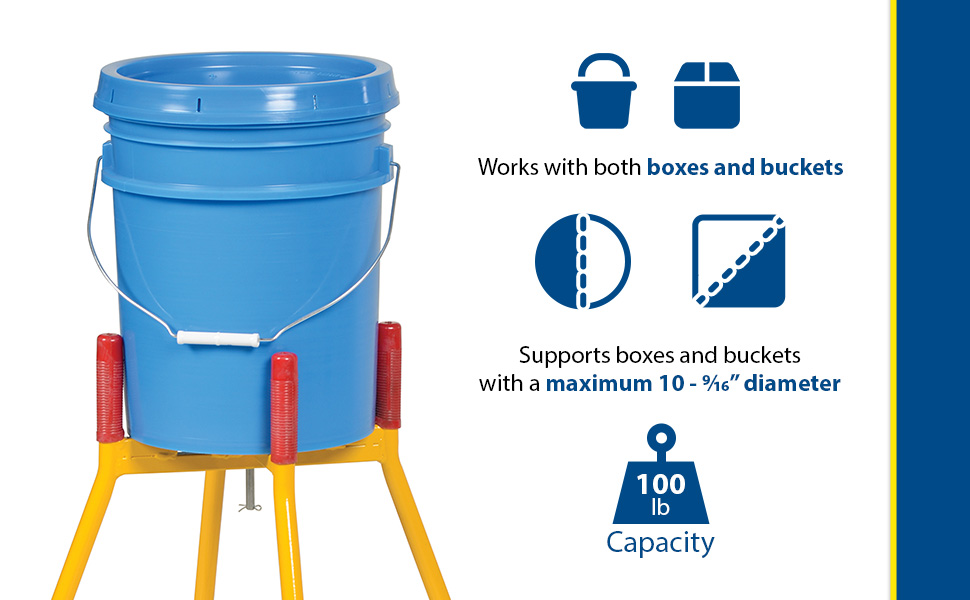 Unique dolly features elevated bucket/pail platform for better ergonomic position. Elevated platform allows for better posture during use, which leads to less fatigue and strain. For use with maximum 10-9/16" diameter round buckets. Also works with square buckets and boxes with maximum size 10-9/16" x 10-9/16". Design folds flat easily for storage when not in use. Portable on four (4) swivel poly casters. Steel construction with a yellow baked-in powder-coated toughness.