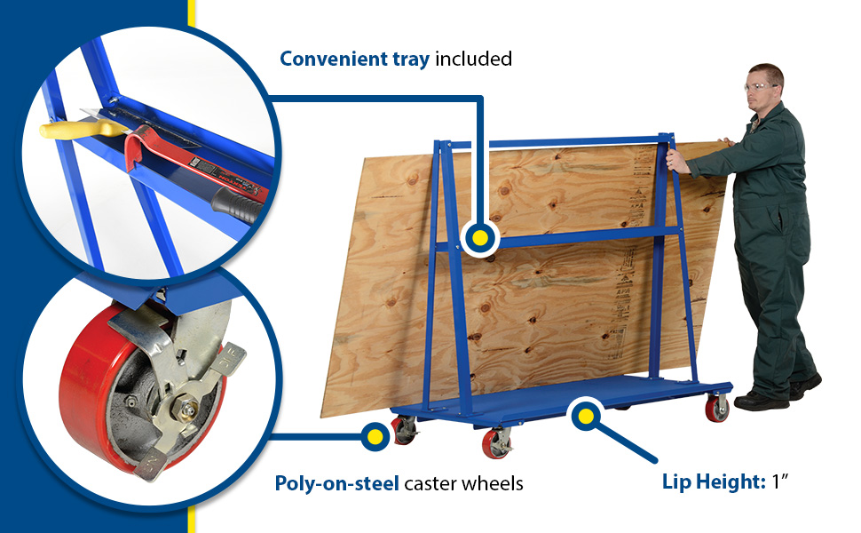 If you need to move bulky sheets of material such as drywall, plywood, paneling, or sheets of metal, you need the heavy-duty A-Frame Cart. A 1" high lip along the length of the cart prevents materials from sliding off. A convenient parts tray is included between the A-frame uprights. Unit is easily secured for loading and unloading by using the foot operated caster brake. Includes two (2) rigid and two (2) swivel with brake casters. All steel construction with a baked-in powder-coated toughness. Ships knockdown, assembly required.
