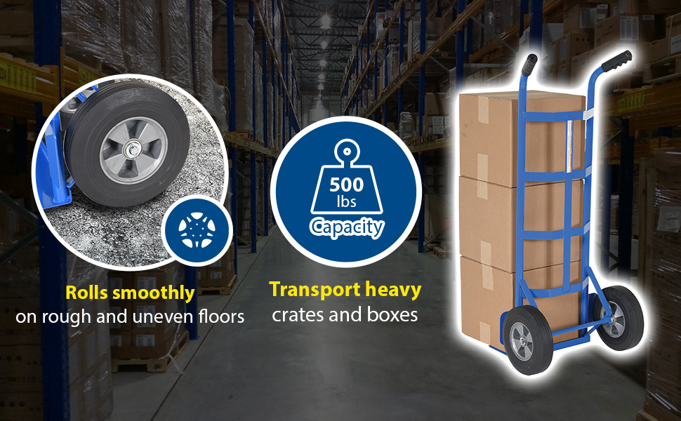 • Hand truck design transports loads over rough floors