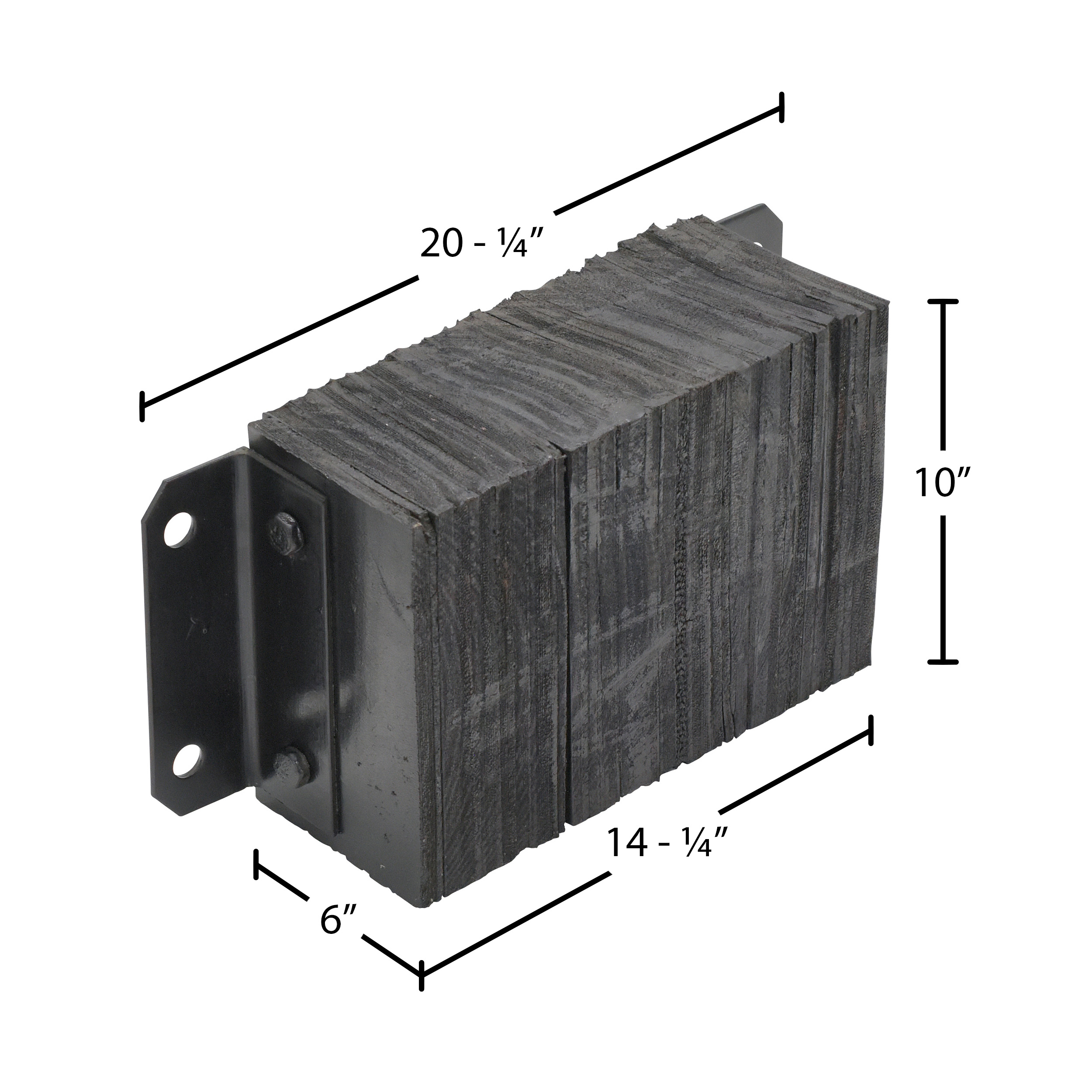 The laminated Dock Bumper provides durable, economical protection for loading docks and trailers. This unit is constructed of fabric reinforced rubber from recycled truck tires. The pads are laminated between painted structural angles and held together with steel tie rods. The width is bolt hole center to bolt hole center. Installation hardware sold separately.